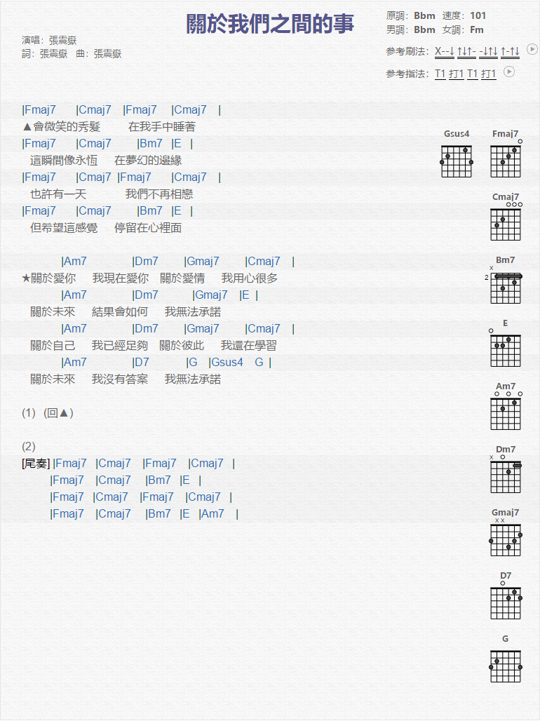 曲谱介绍: 张震岳《关于我们之间的事》吉他弹唱谱,采用B调指法编配,共有1张高清图谱,免翻页排版设计。