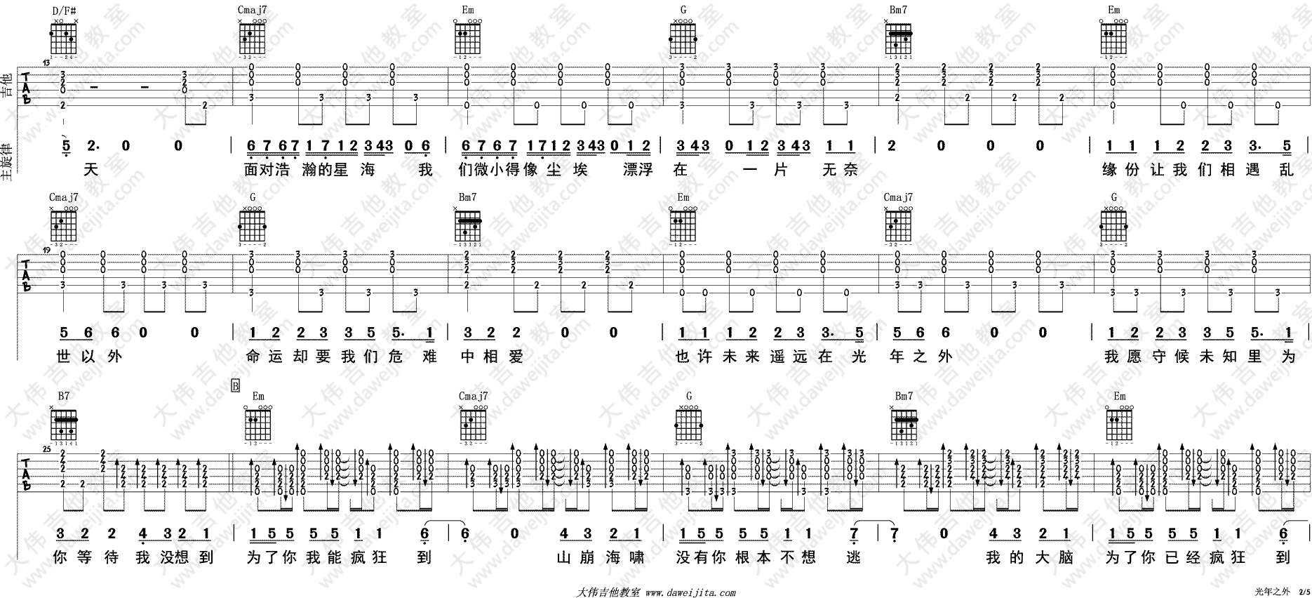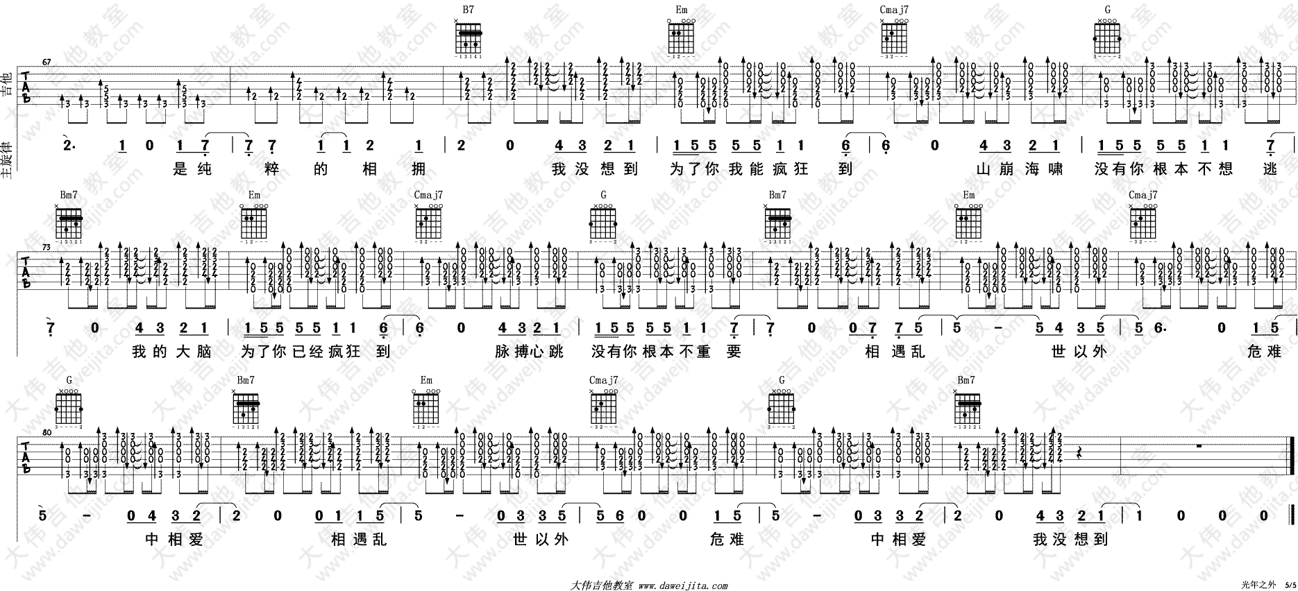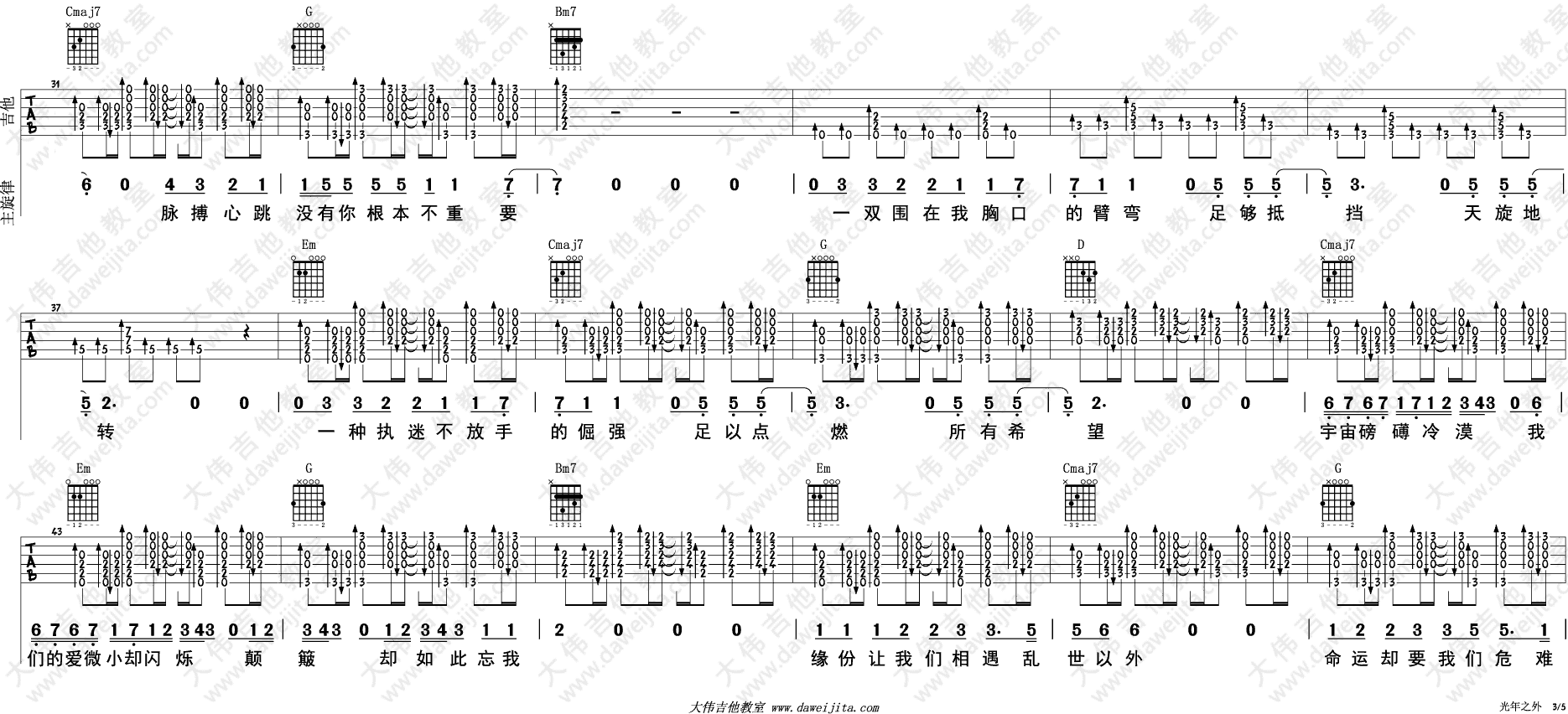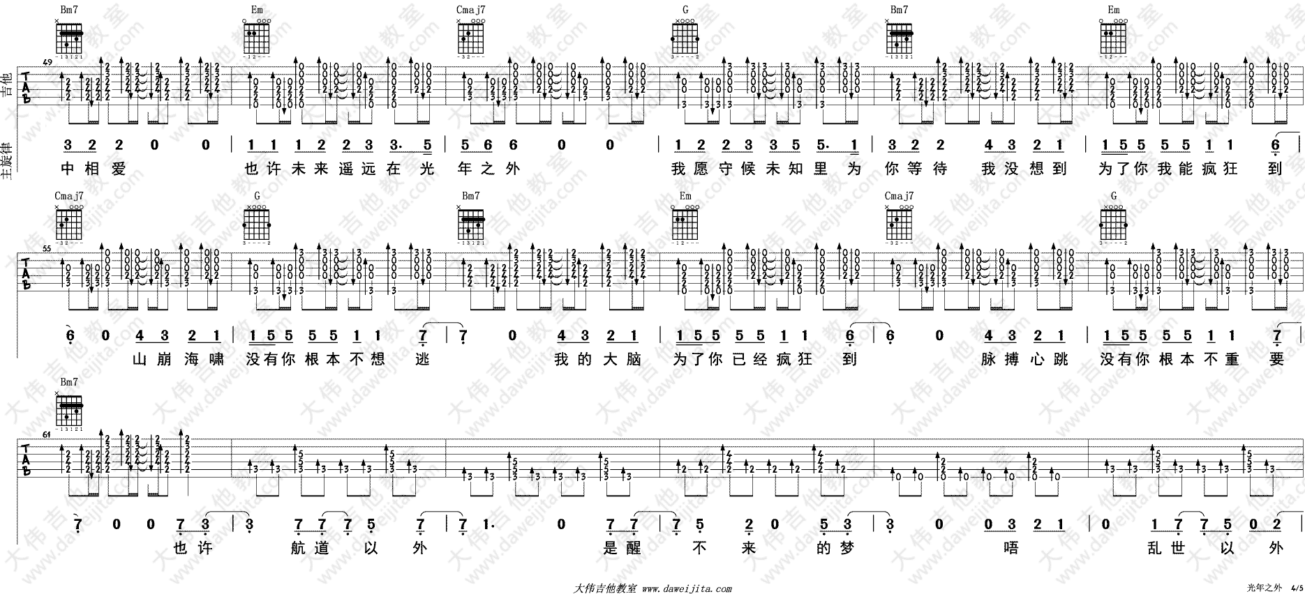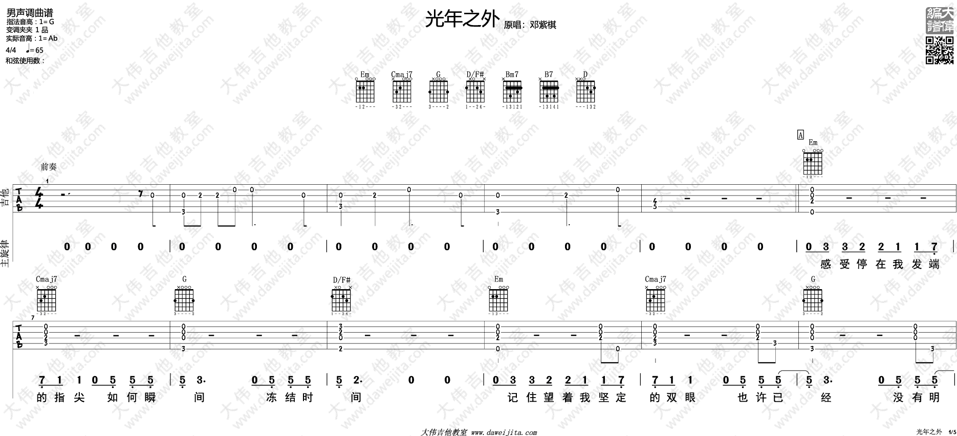 曲谱介绍: 邓紫棋《光年之外》吉他弹唱谱,采用G调指法编配,共有5张高清图谱。