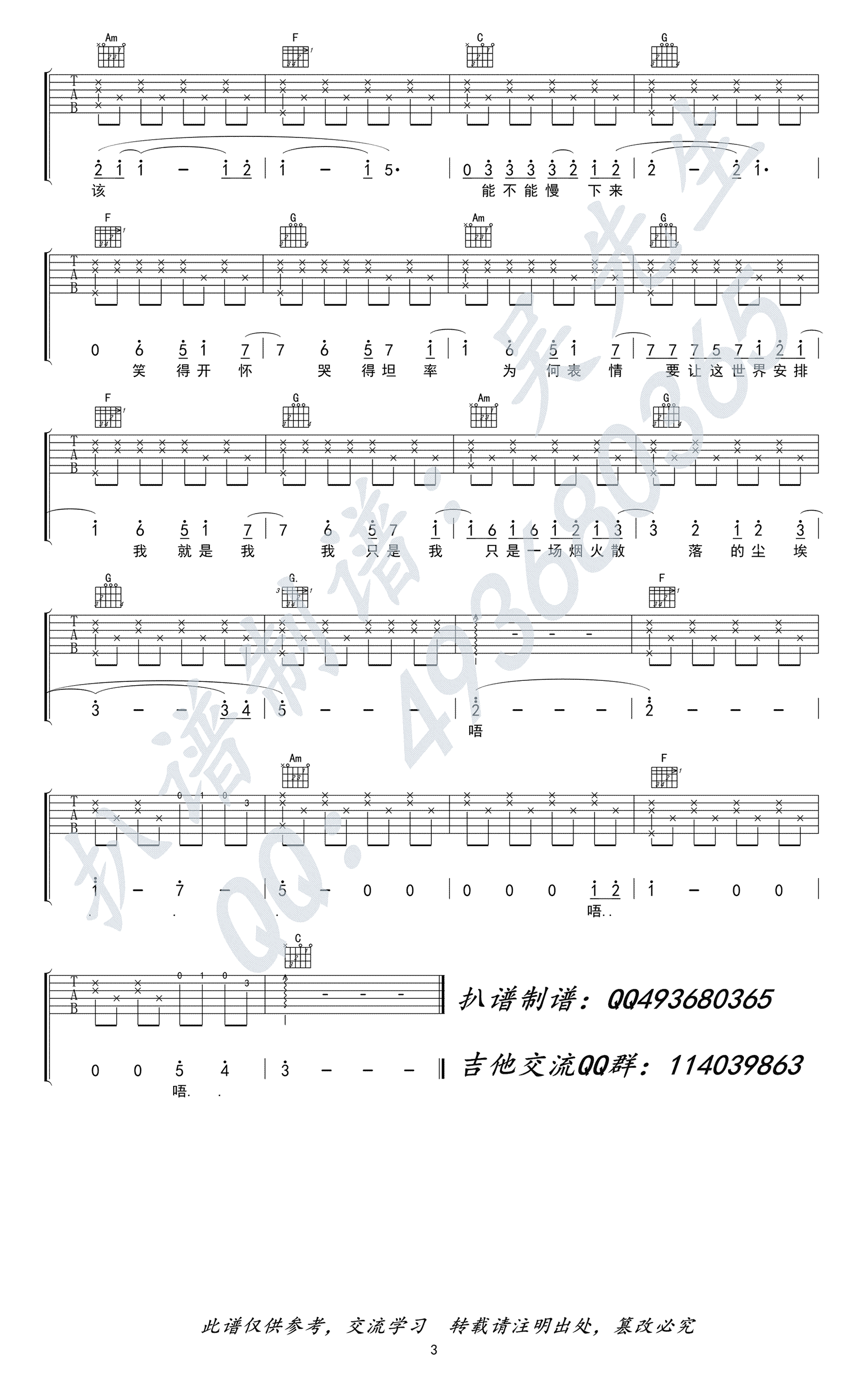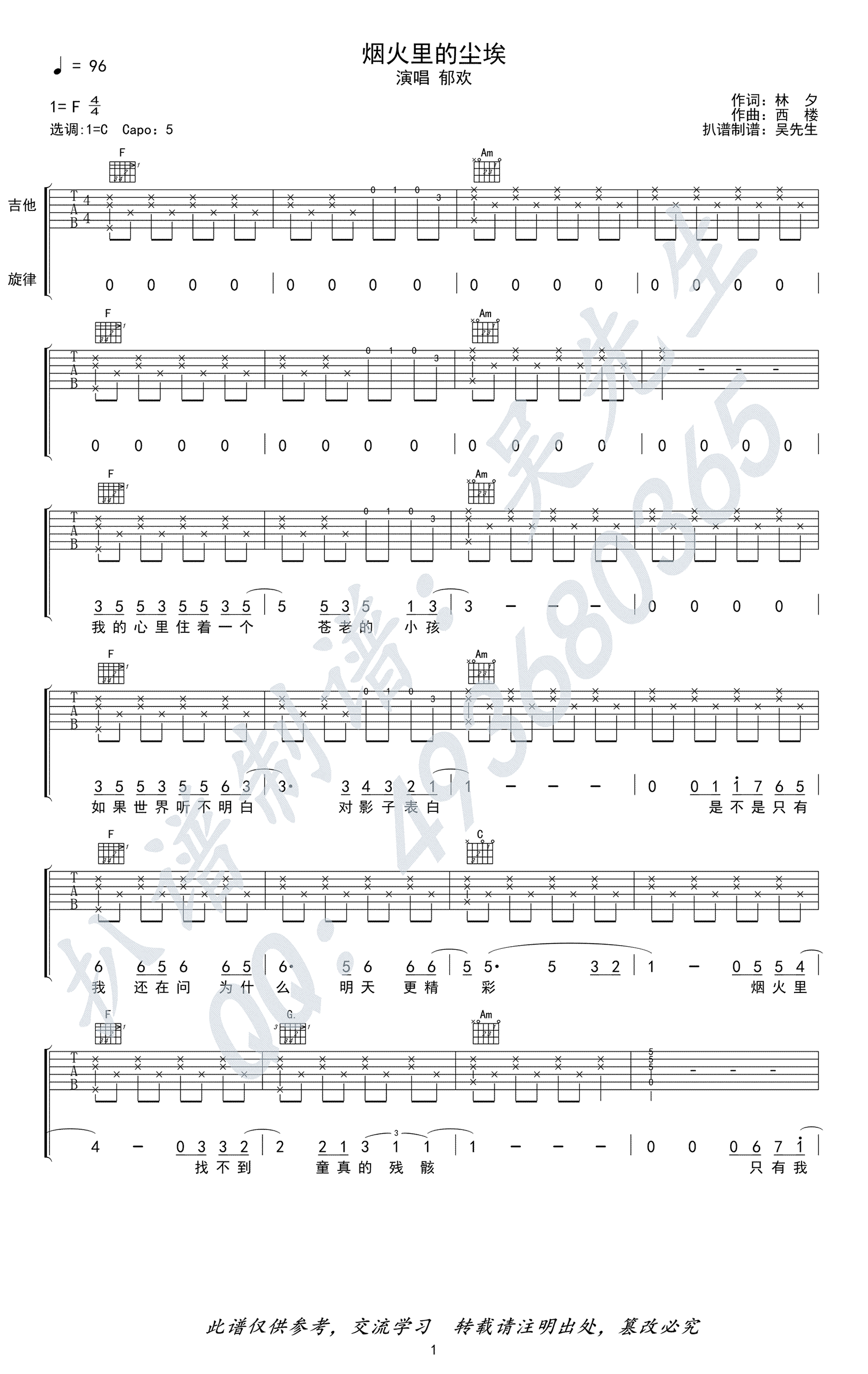 曲谱介绍: 郁欢《烟火里的尘埃》吉他弹唱谱,采用F调指法编配,共有3张高清图谱。