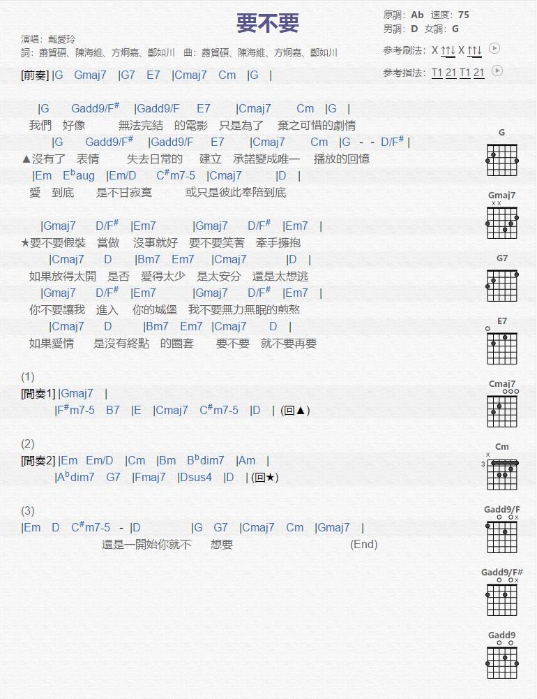 曲谱介绍: 戴爱玲《要不要》吉他弹唱谱,采用G调指法编配,共有1张高清图谱,免翻页排版设计。