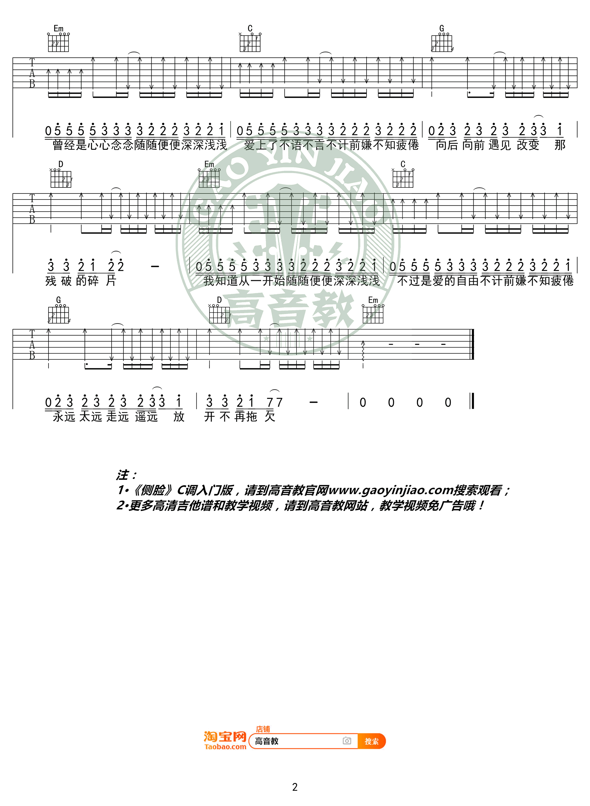 曲谱介绍: 于果《侧脸》吉他弹唱谱,采用G调指法编配,共有2张高清图谱,免翻页排版设计。