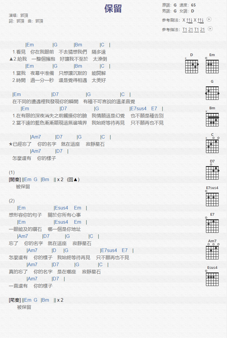 曲谱介绍: 郭顶《保留》吉他弹唱谱,采用G调指法编配,共有1张高清图谱,免翻页排版设计。