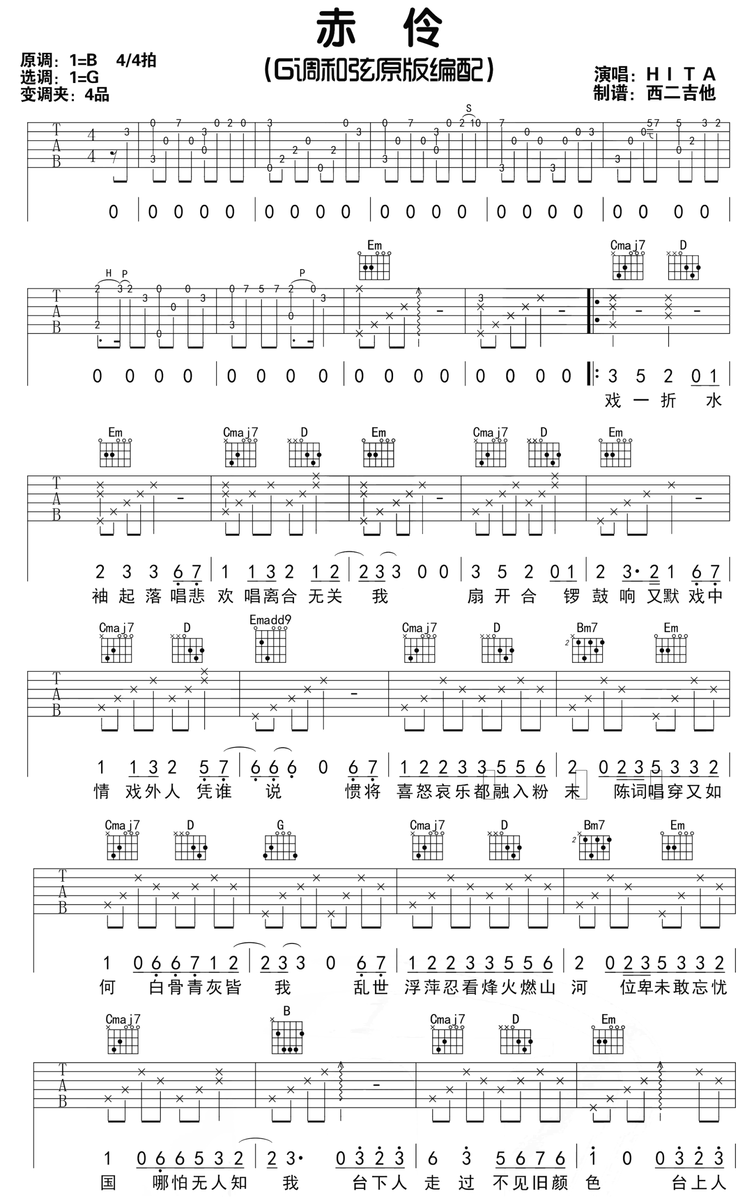 赤伶吉他谱 - HITA - G调吉他弹唱谱