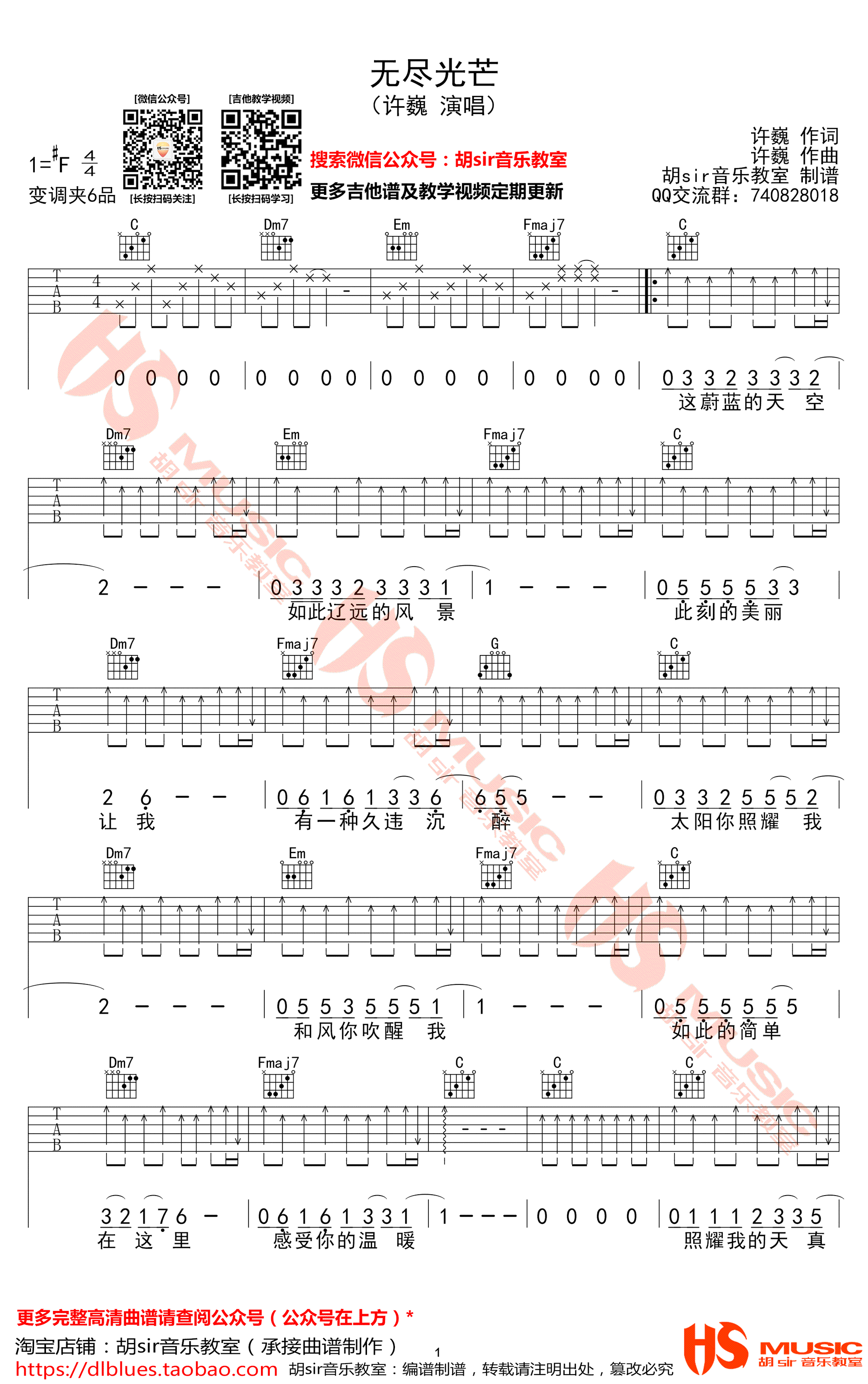 曲谱介绍: 许巍《无尽光芒》吉他弹唱谱,采用F调指法编配,共有2张高清图谱,免翻页排版设计。