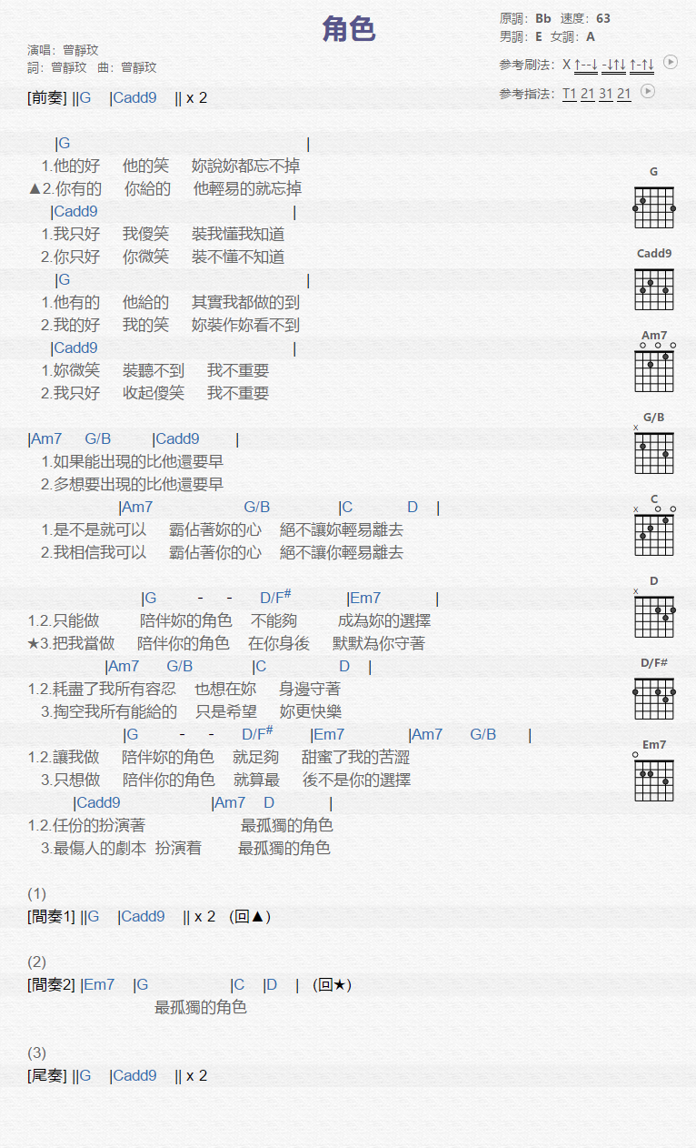曲谱介绍: 曾静玟《角色》吉他弹唱谱,采用B调指法编配,共有1张高清图谱,免翻页排版设计。