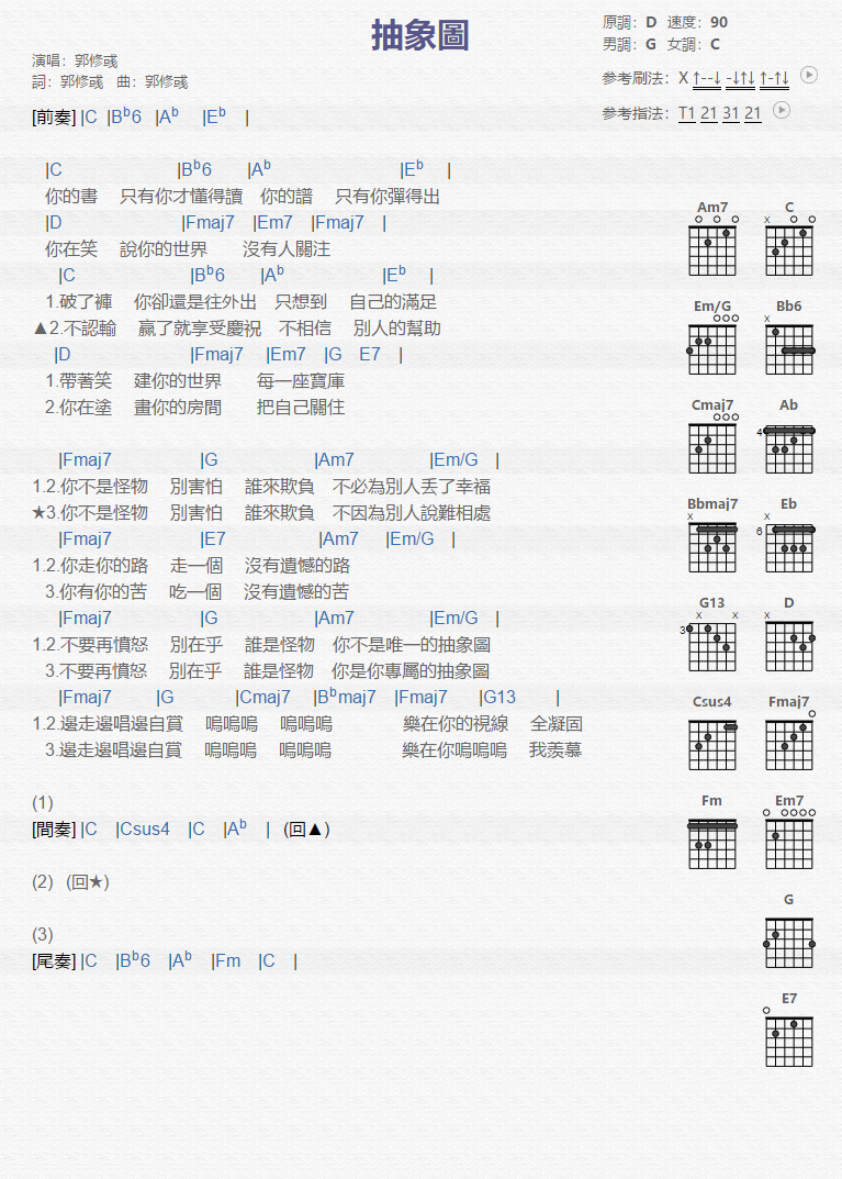 曲谱介绍: 郭修彧《抽象图》吉他弹唱谱,采用D调指法编配,共有1张高清图谱,免翻页排版设计。