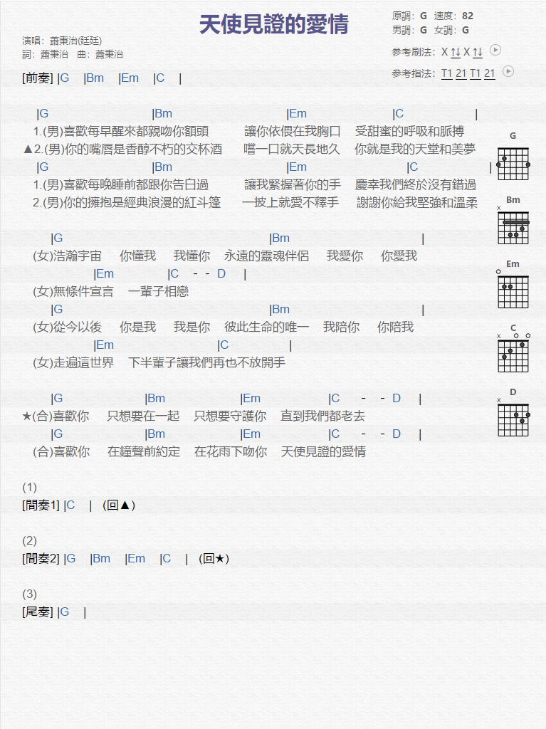 曲谱介绍: 萧秉治《天使见证的爱情》吉他弹唱谱,采用G调指法编配,共有1张高清图谱,免翻页排版设计。