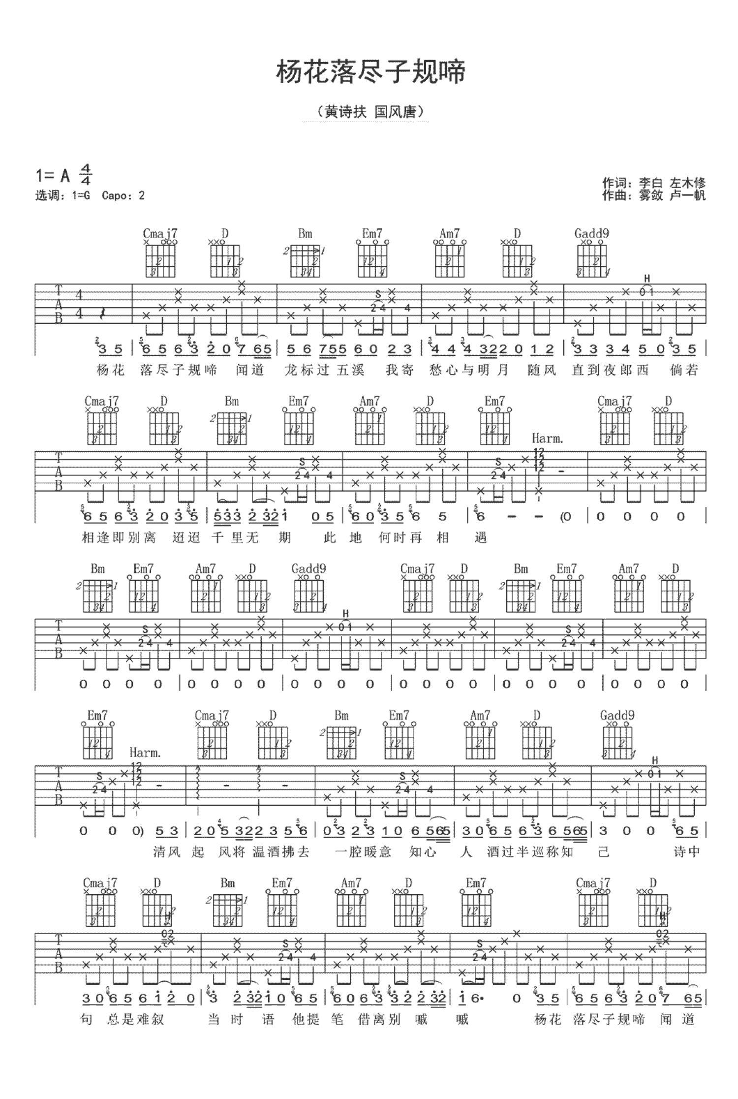 曲谱介绍: 《杨花落尽子规啼》吉他谱,黄诗扶演唱,一首致敬唐朝诗人李白的古风歌曲,G2er作曲。杨花落尽子规啼六线谱,原调A,选用G调指法,CAPO夹二品。传统与现代音乐的结合,一首《闻王昌龄左迁龙标遥有此寄》的诗编成歌曲,通过丰富的想象,抒写志同道合的友情,本来无知无情的明月,竟变成了一个了解自己,富于同情的知心人,她能够而且愿意接受自己的要求,将自己对朋友的怀念和同情带到辽远的夜郎之西,交给那不幸的迁谪者。