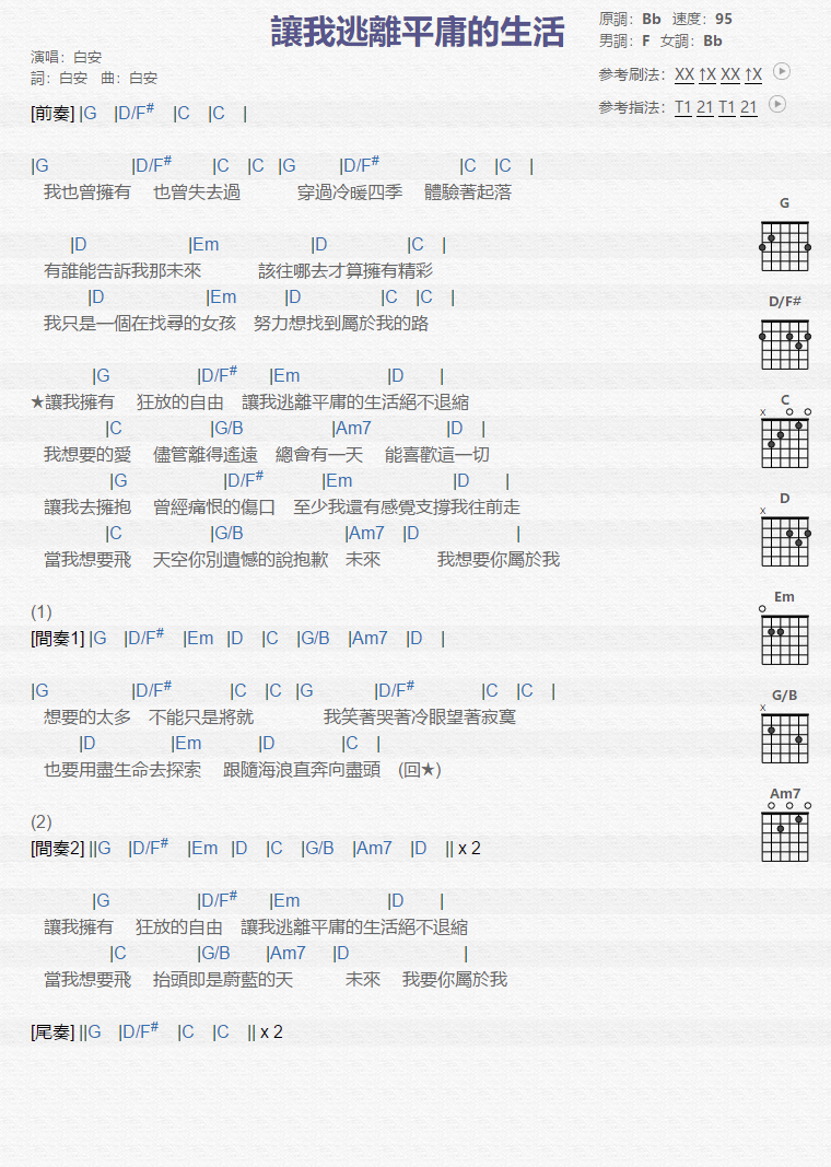 曲谱介绍: 白安《让我逃离平庸的生活》吉他弹唱谱,采用B调指法编配,共有1张高清图谱,免翻页排版设计。