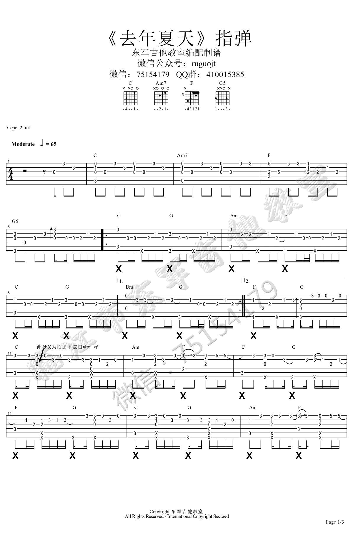 曲谱介绍: 王大毛《去年夏天》吉他独奏谱,共有3张高清图谱。
