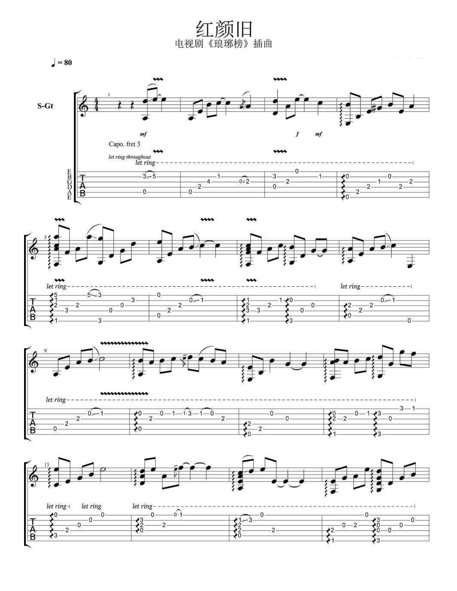 曲谱介绍: 红颜旧指弹吉他谱,电视剧《琅琊榜》插曲改编,红颜旧吉他独奏谱,Capo夹四品,吉他谱完整版四张图片谱例,靠谱吉他大赛优秀指弹作品,感谢胡鹏编配分享。附上老师的指弹视频示范。