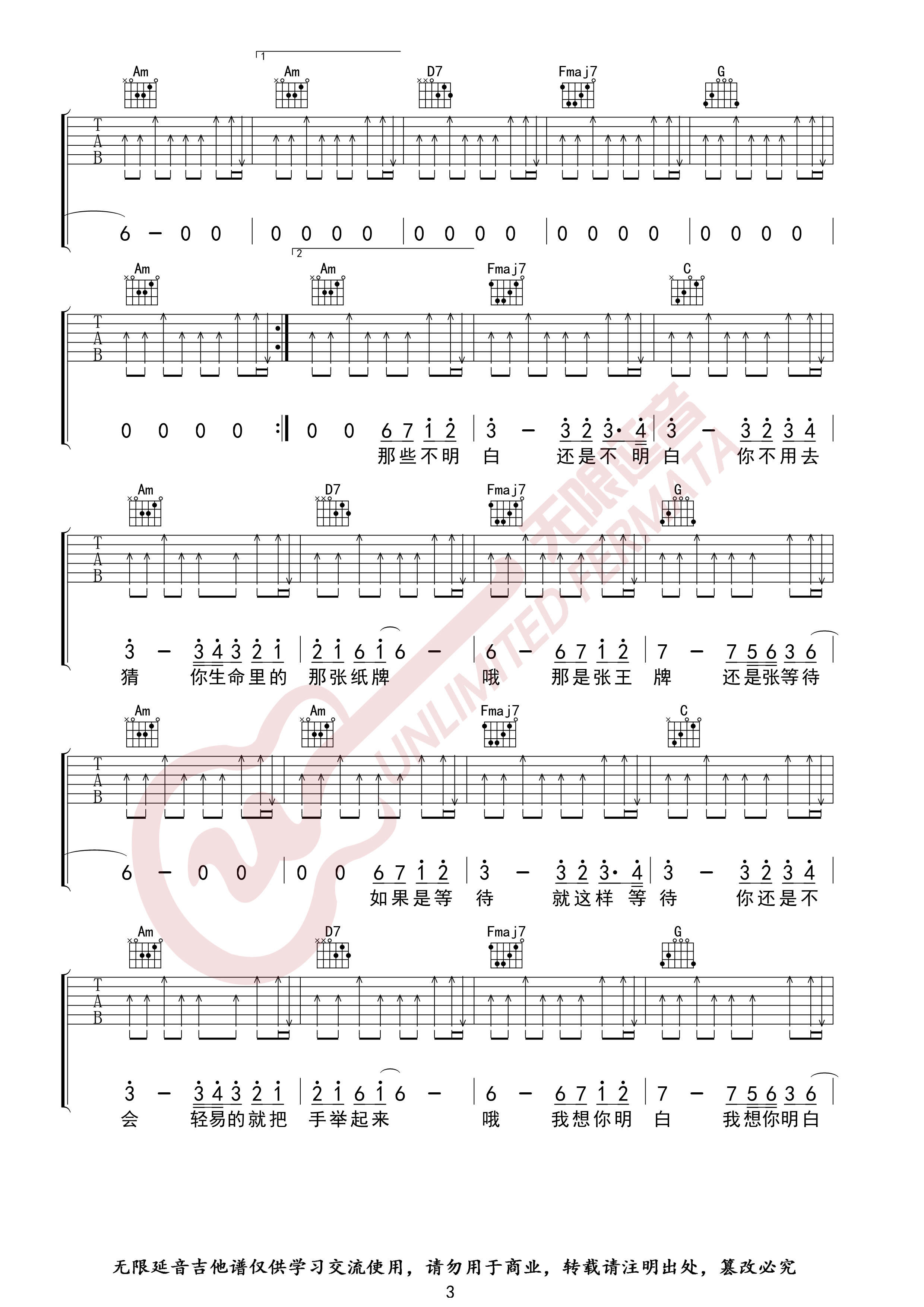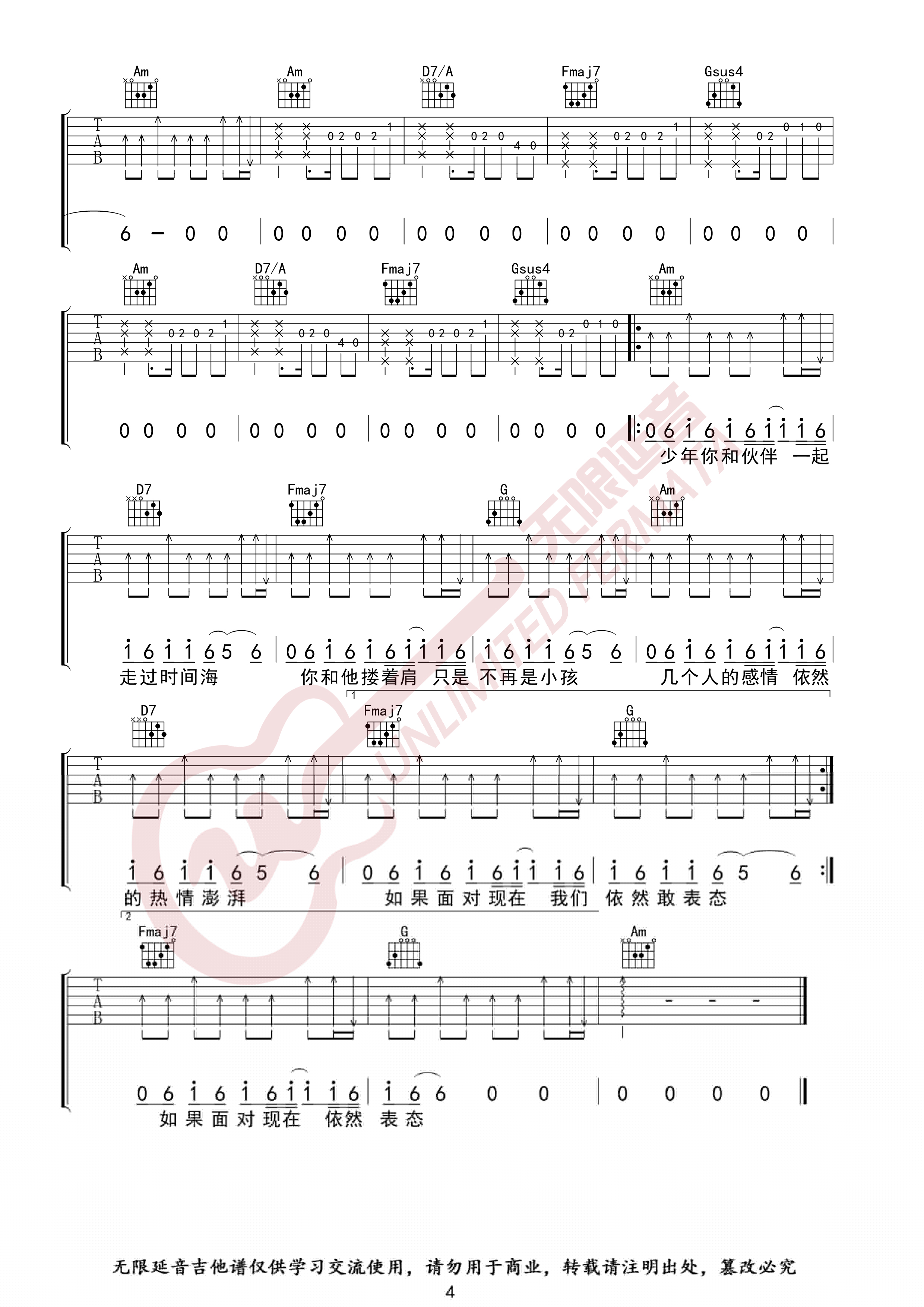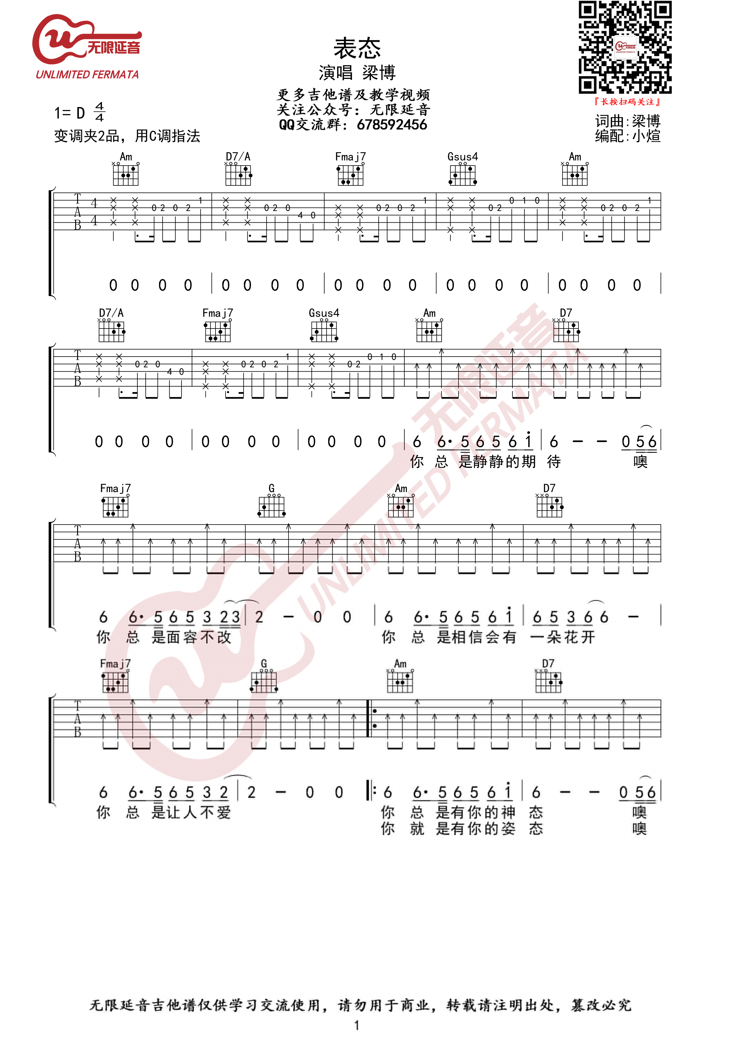 曲谱介绍: 梁博《表态》吉他弹唱谱,采用D调指法编配,共有4张高清图谱。