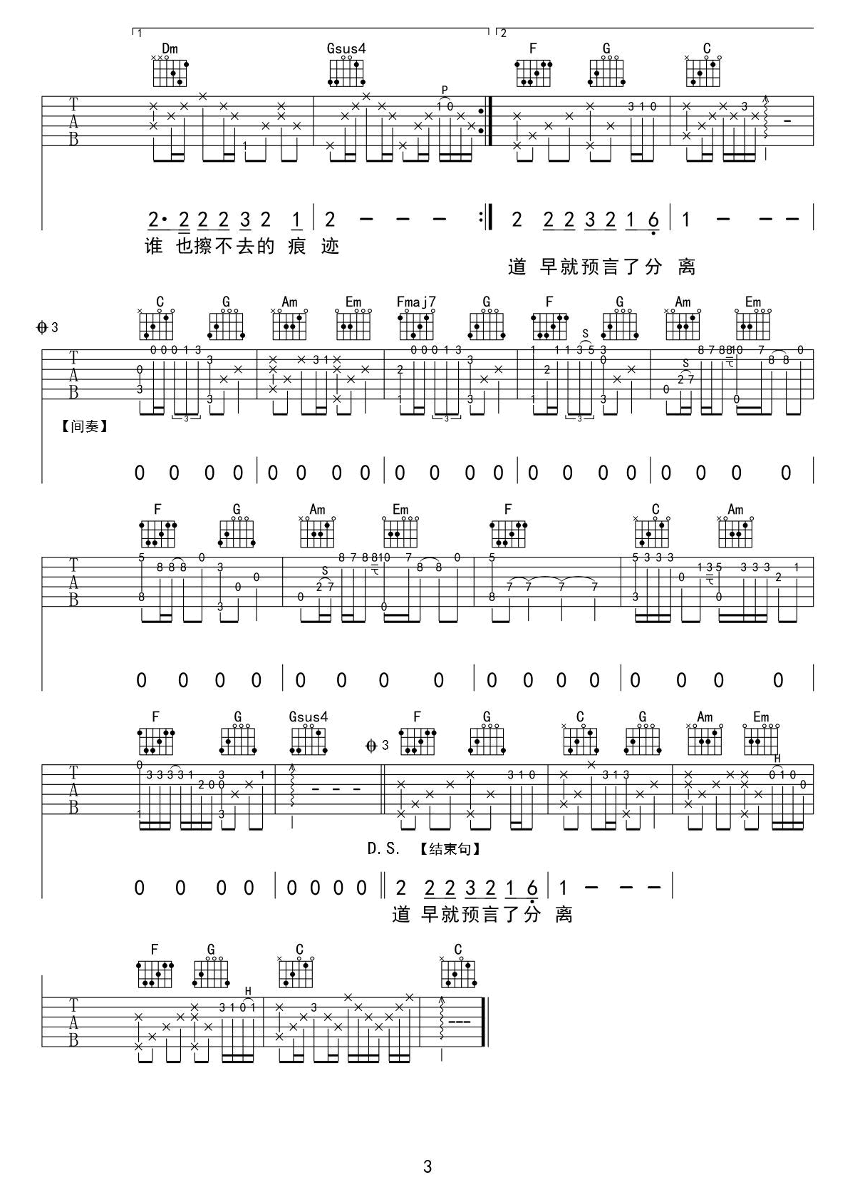 曲谱介绍: 张惠妹《哭砂》吉他弹唱谱,采用D调指法编配,共有3张高清图谱。