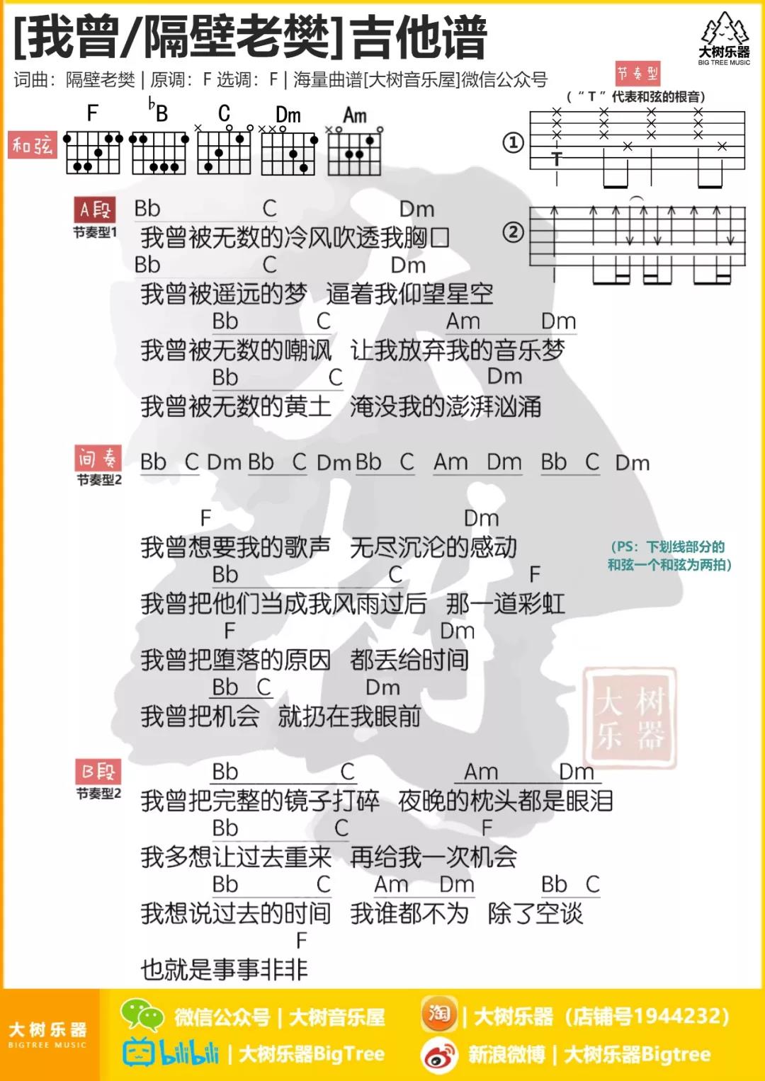 曲谱介绍: 隔壁老樊《我曾》吉他弹唱谱,采用F调指法编配,共有1张高清图谱,免翻页排版设计。