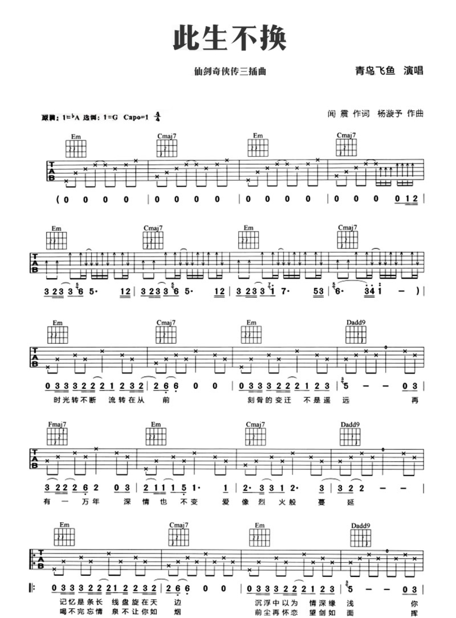 曲谱介绍: 青鸟飞鱼演唱的此生不换吉他谱,曲谱为图片谱格式,六线谱编配,原调bA,选调G,Capo夹一品。此生不换吉他弹唱谱,歌曲是电视连续剧《仙剑奇侠传三》的主题曲。灯火阑珊,醉抛玉盏。乐颜入画,情牵一线。入耳的是动听的旋律,眼见的是华丽的舞步。心随影动,只因你们是此生不换的独一无二。