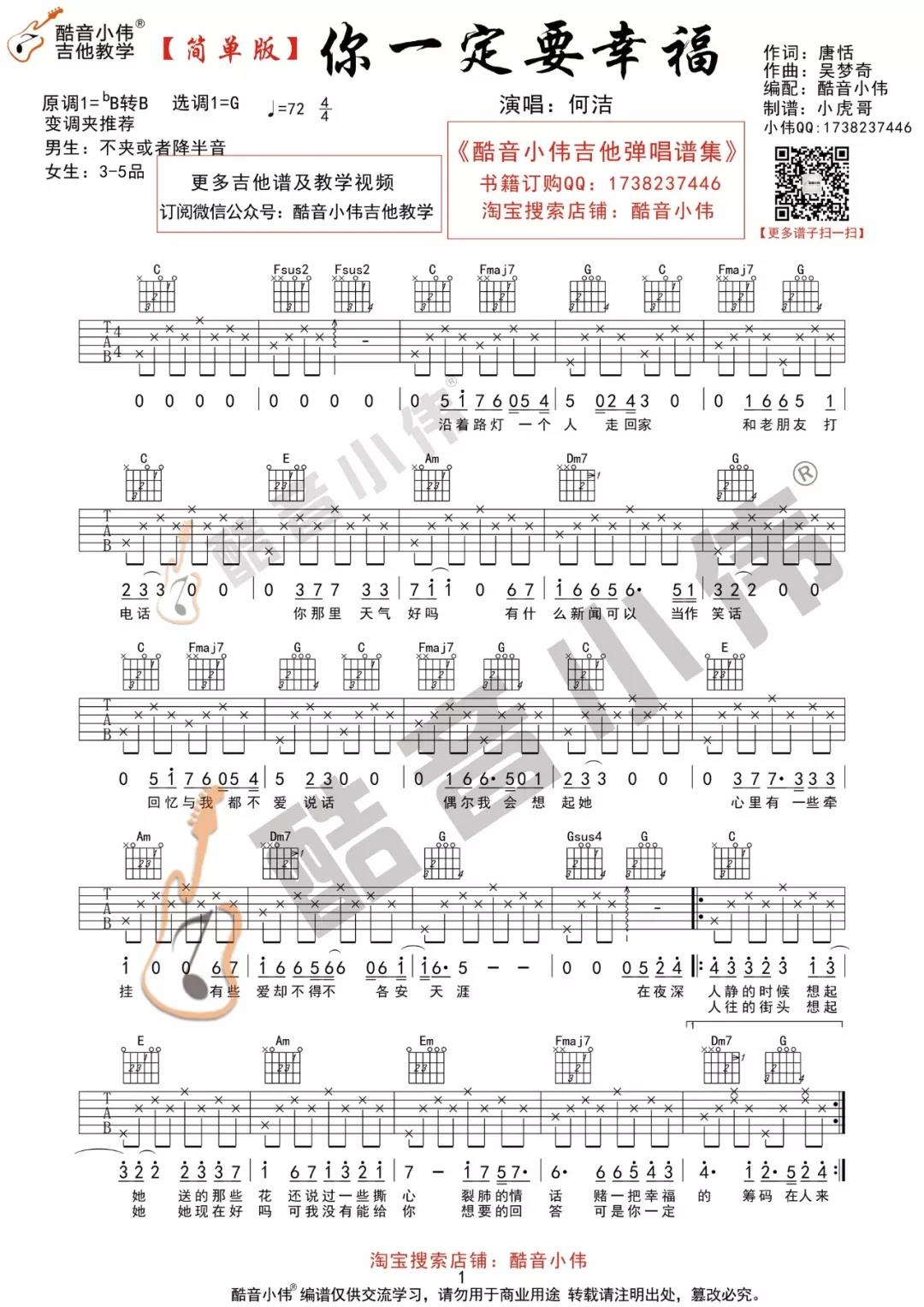 曲谱介绍: 何洁《你一定要幸福简单版》吉他弹唱谱,采用G调指法编配,共有2张高清图谱,免翻页排版设计。