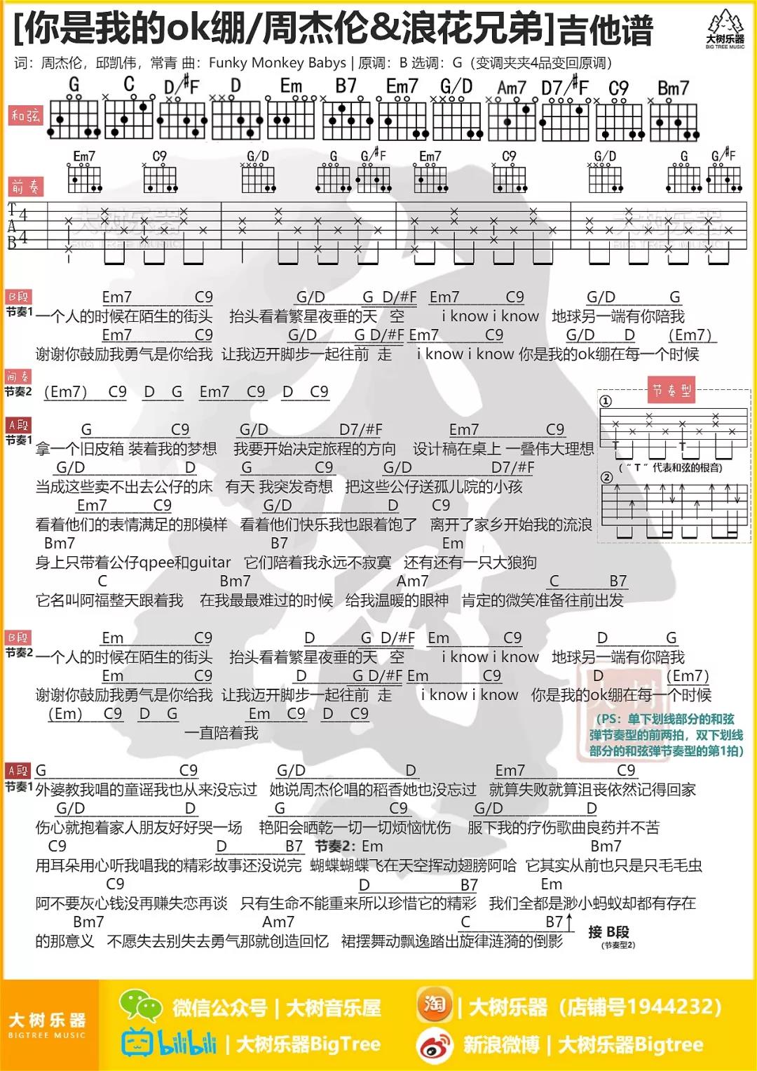 曲谱介绍: 周杰伦,浪花兄弟《你是我的ok绷》吉他弹唱谱,采用G调指法编配,共有1张高清图谱,免翻页排版设计。