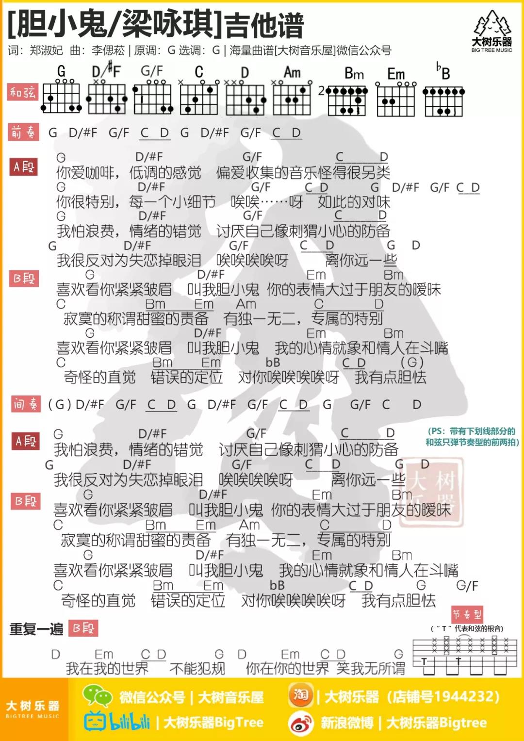 曲谱介绍: 梁咏琪《胆小鬼》吉他弹唱谱,采用G调指法编配,共有1张高清图谱,免翻页排版设计。