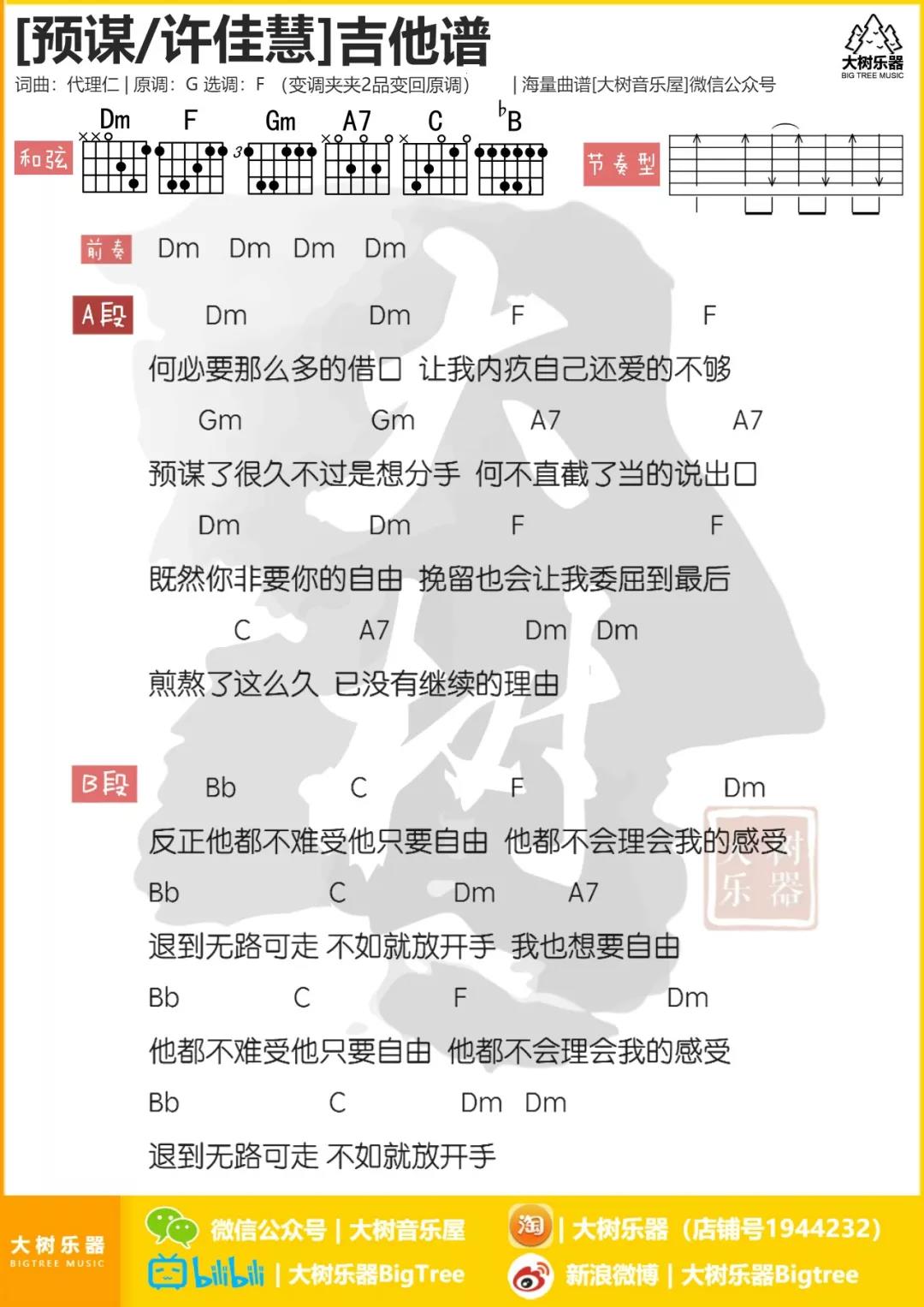 曲谱介绍: 许佳慧《预谋》吉他弹唱谱,采用F调指法编配,共有1张高清图谱,免翻页排版设计。