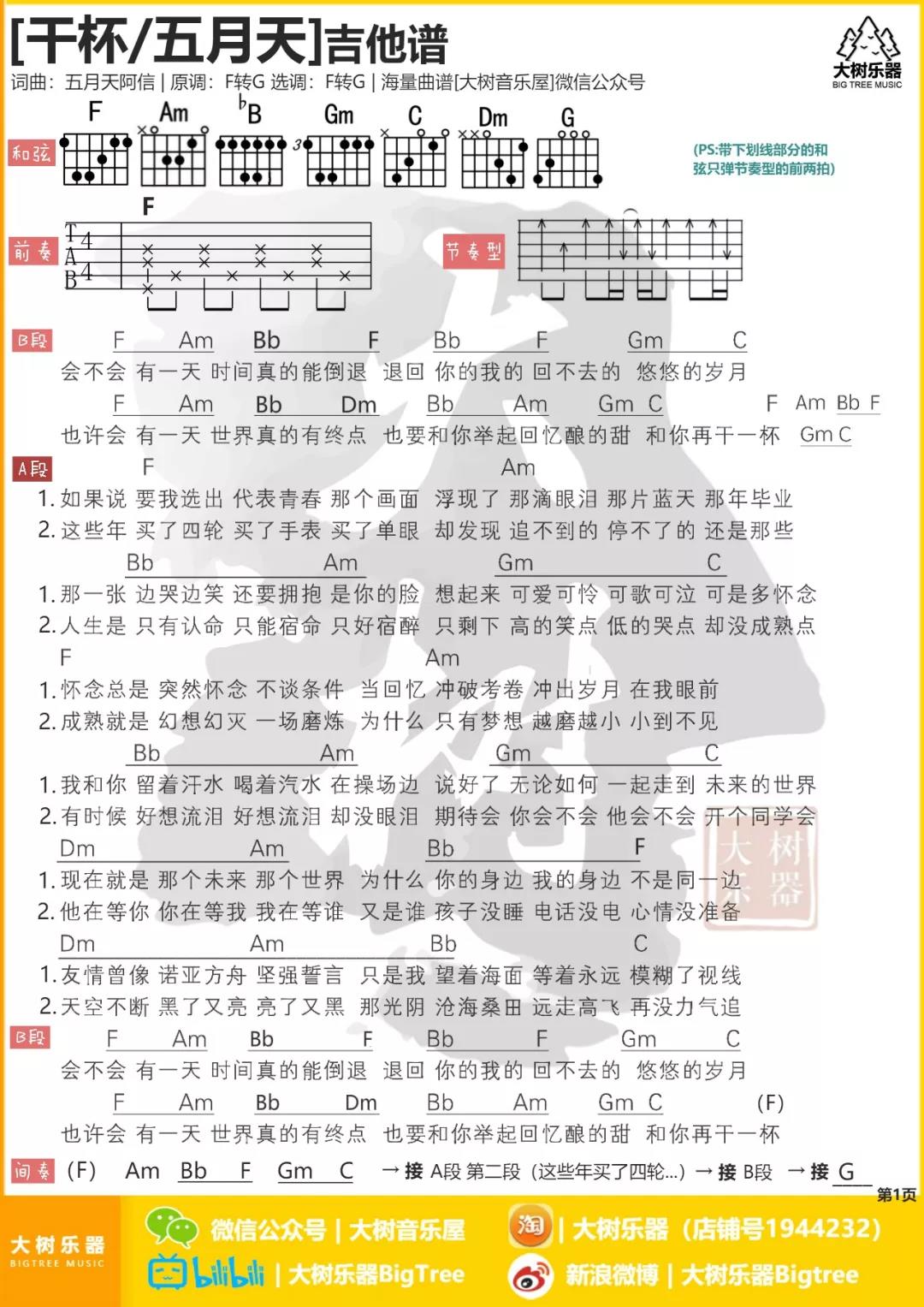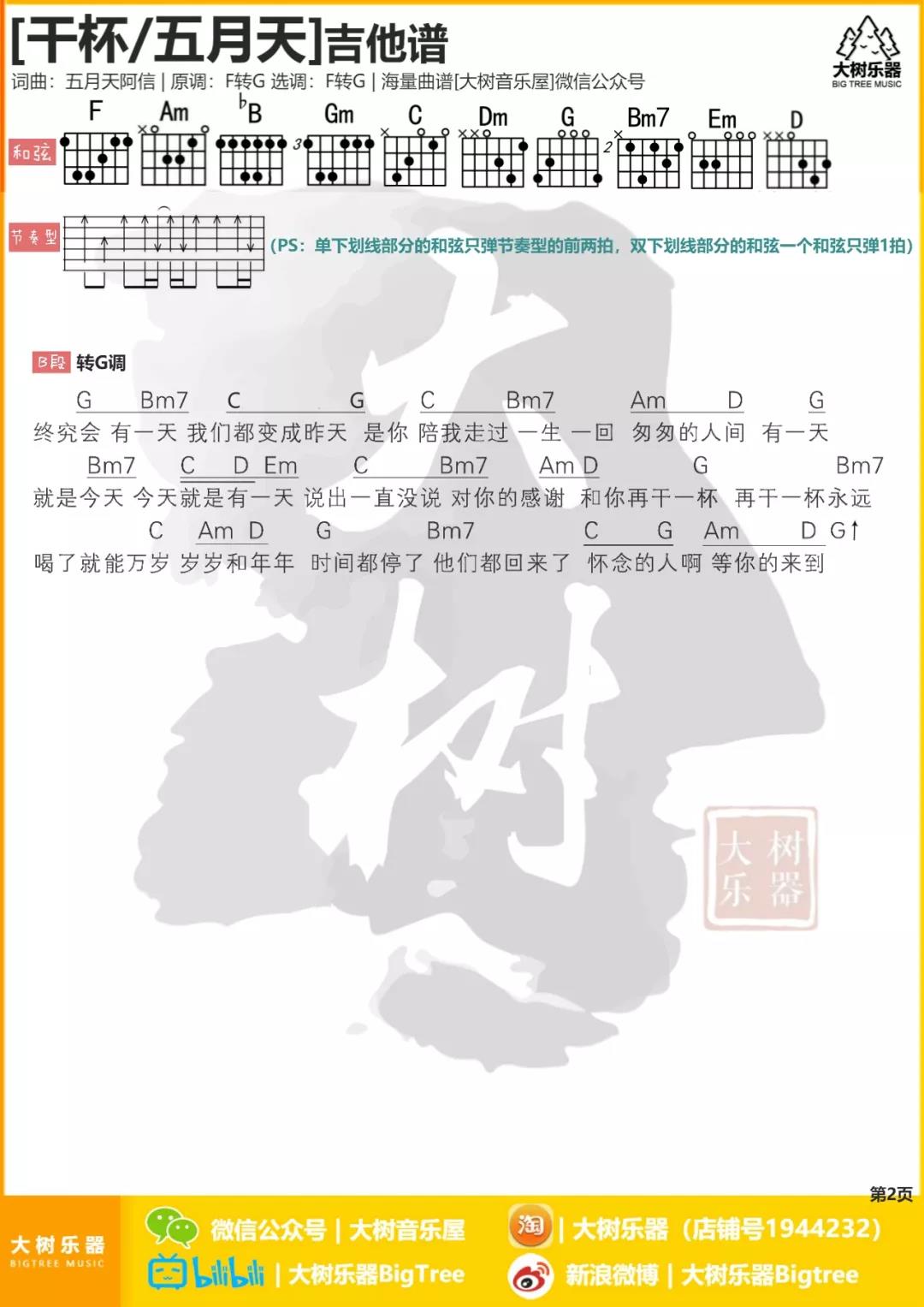 曲谱介绍: 五月天《干杯》吉他弹唱谱,采用G调指法编配,共有2张高清图谱,免翻页排版设计。