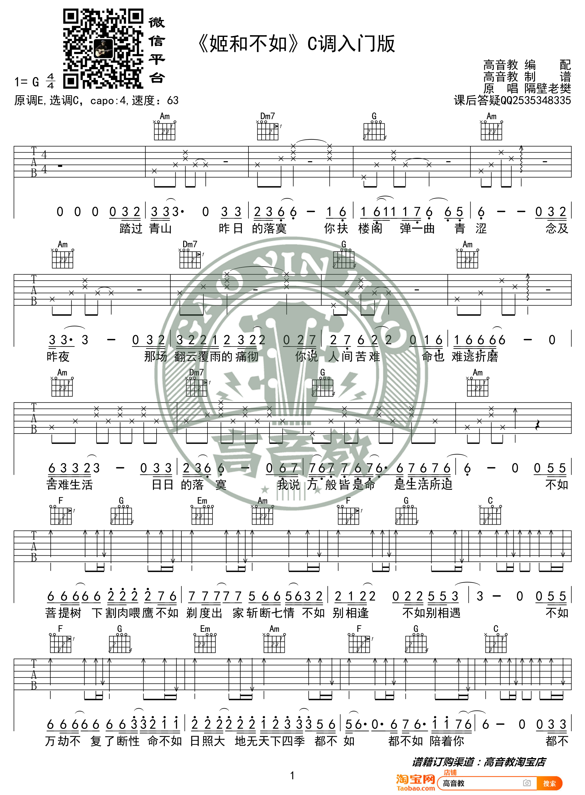 曲谱介绍: 隔壁老樊《姬和不如》吉他弹唱谱,采用G调指法编配,共有2张高清图谱,免翻页排版设计。
