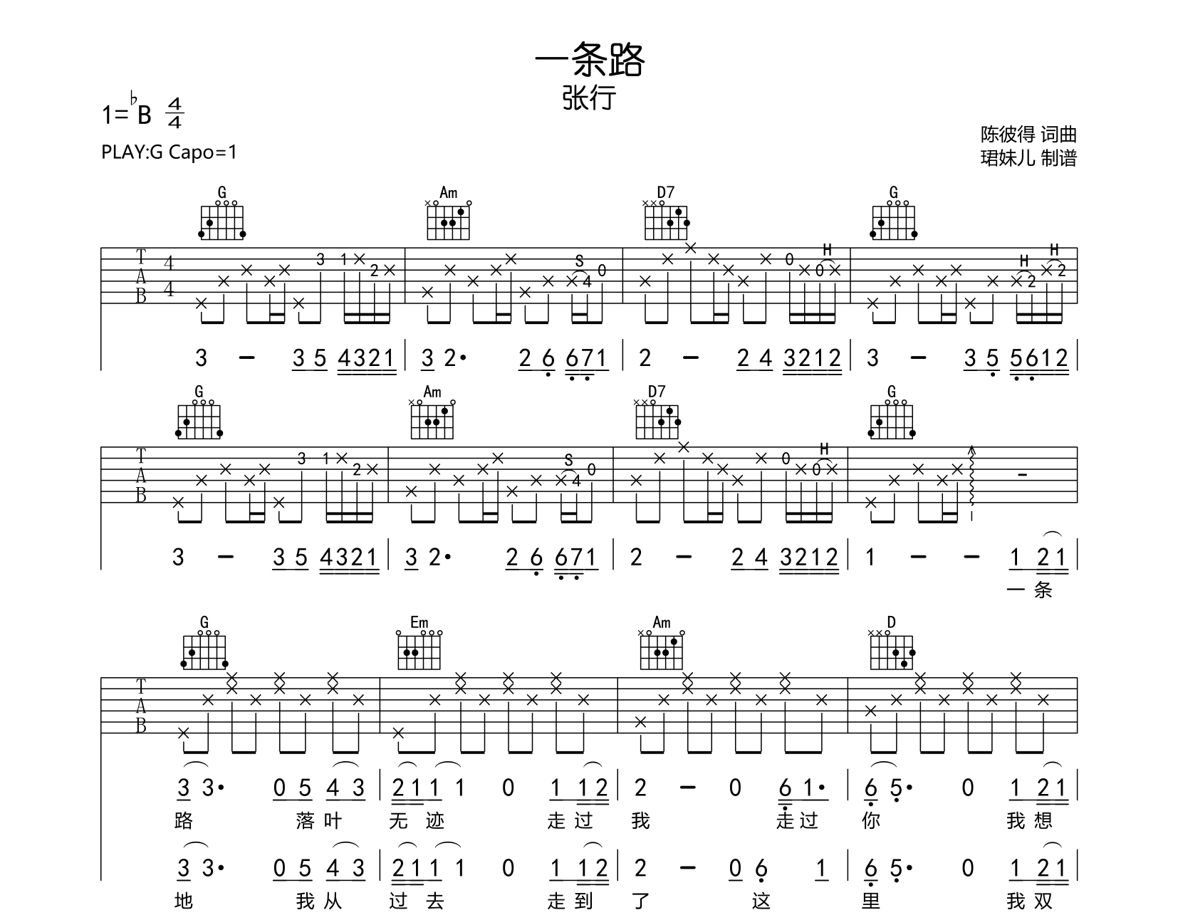 一条路吉他谱 - 张行 - G调吉他弹唱谱