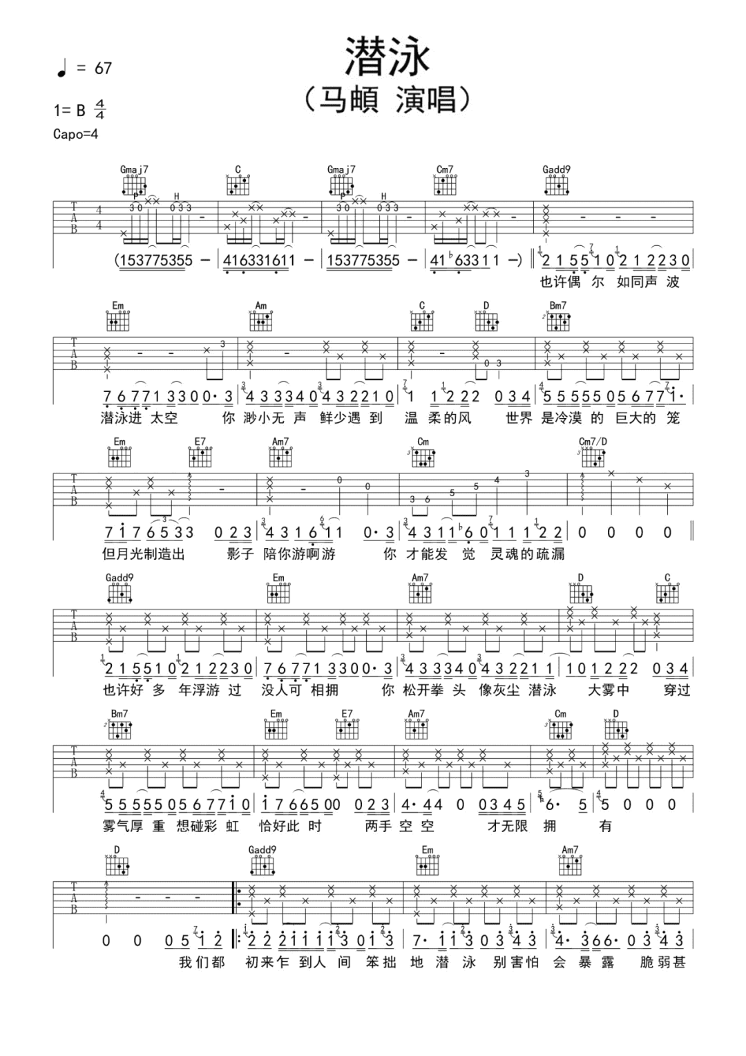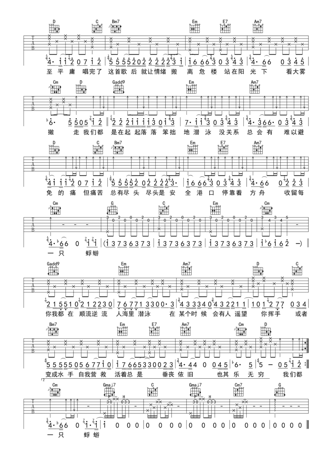 曲谱介绍: 吉他谱介绍:潜泳吉他谱,马頔演唱的一首歌曲,4/4拍的节奏,这首歌曲的原调为B调,这里曲谱采用了G调指法进行编配,演唱时夹变调夹4品可回到原调,也可根据个人实际嗓音情况选择。曲谱由琴谱网更新上传,共2张高清图片弹唱吉他谱例,曲谱来源于网络转载,编配制谱者暂不详。网易云音乐联合理想国,和音乐人马頔一起,在这个特殊的日子,特别呈现一首关于抑郁的温暖治愈歌曲。用音乐表达我们的责任感、传递一份力量,尝试着去和拥抱每一个人海里潜泳的抑郁症患者。