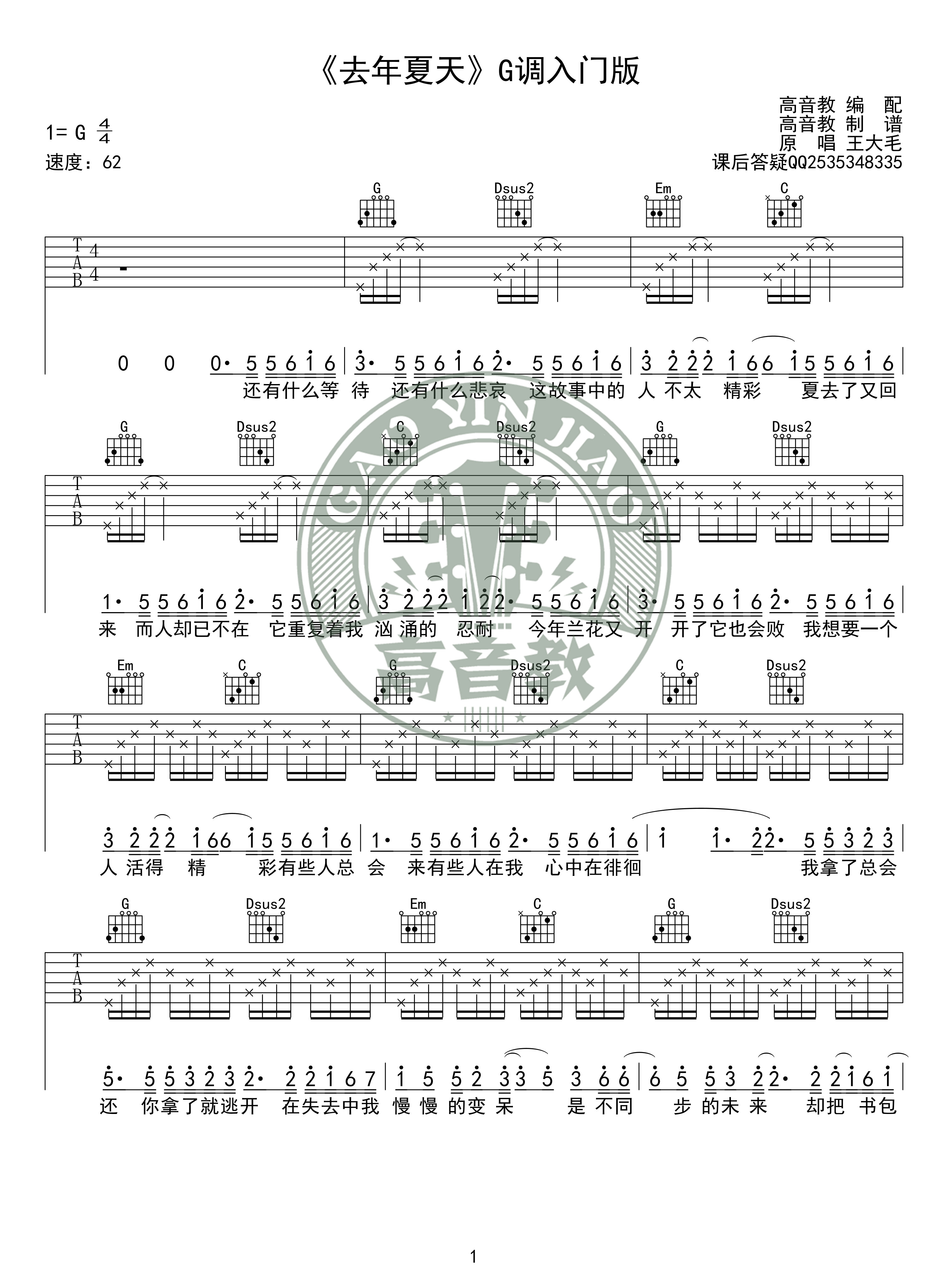 曲谱介绍: 王大毛《去年夏天入门版》吉他弹唱谱,采用G调指法编配,共有4张高清图谱。