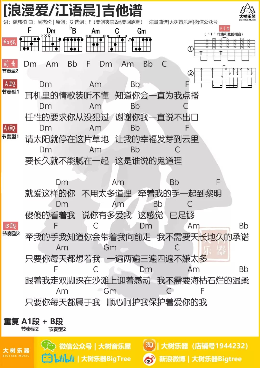 曲谱介绍: 江语晨《浪漫爱》吉他弹唱谱,采用F调指法编配,共有1张高清图谱,免翻页排版设计。