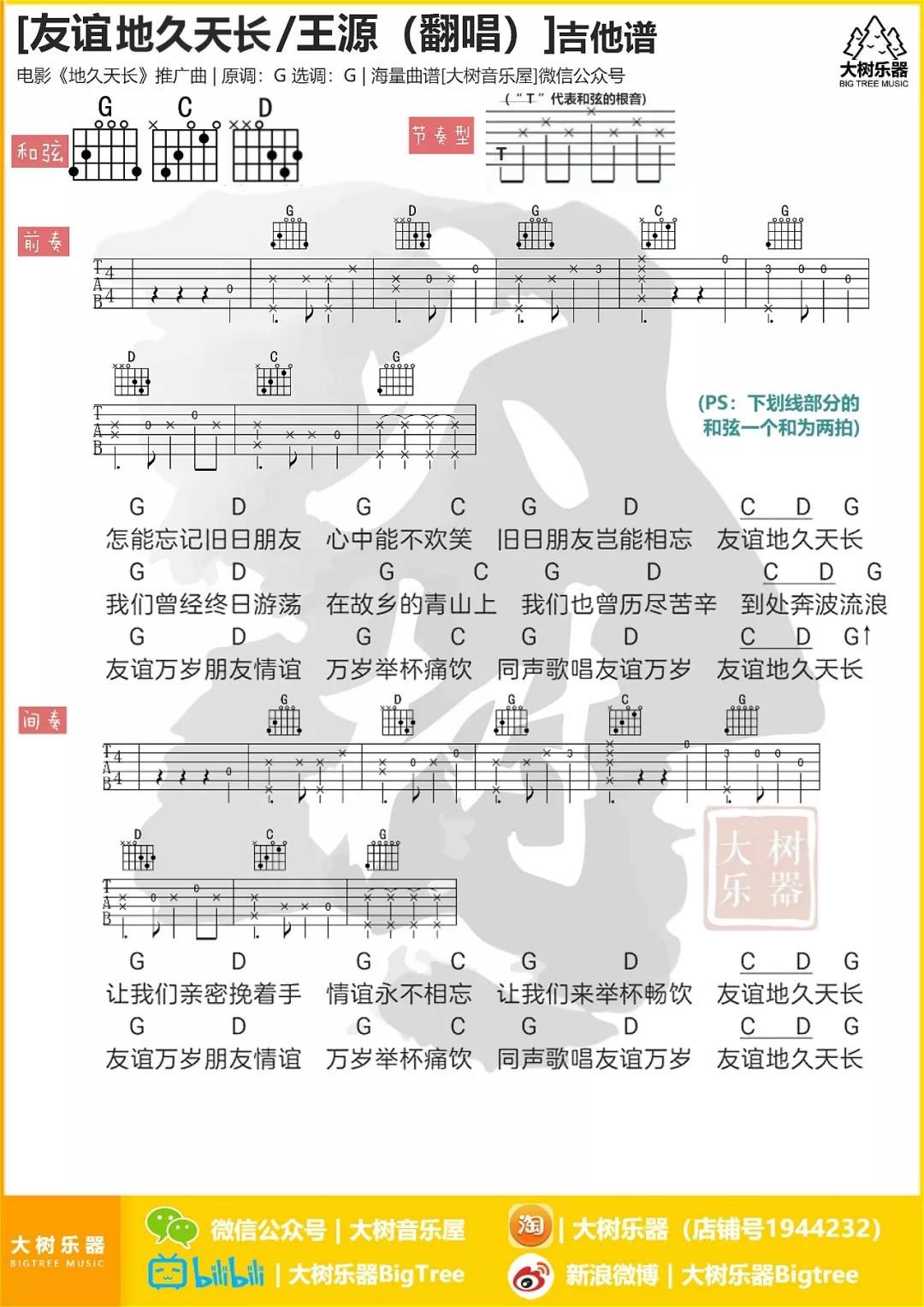 友谊地久天长吉他谱 - 王源 - G调吉他弹唱谱