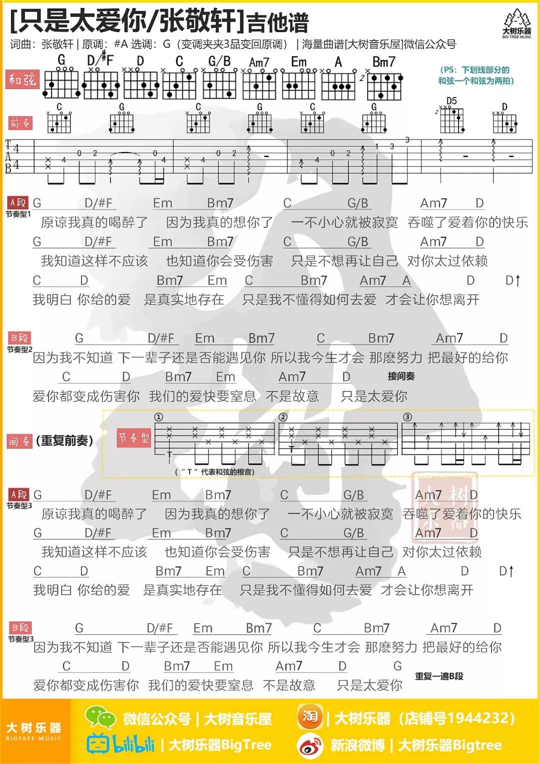 曲谱介绍: 张敬轩《只是太爱你》吉他弹唱谱,采用G调指法编配,共有1张高清图谱,免翻页排版设计。