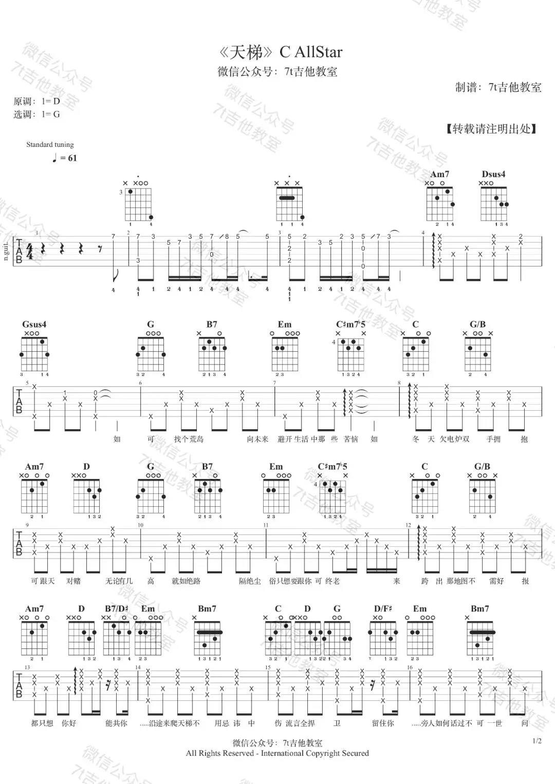 曲谱介绍: C,AllStar《天梯》吉他弹唱谱,采用G调指法编配,共有2张高清图谱,免翻页排版设计。