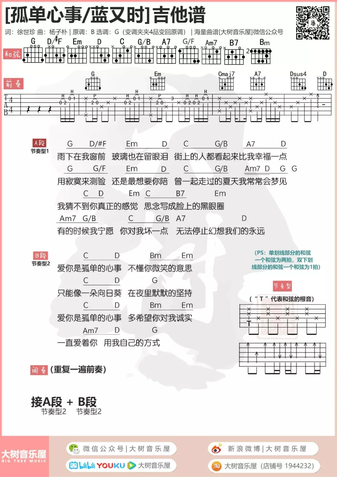 孤单心事吉他谱 - 蓝又时 - G调吉他弹唱谱