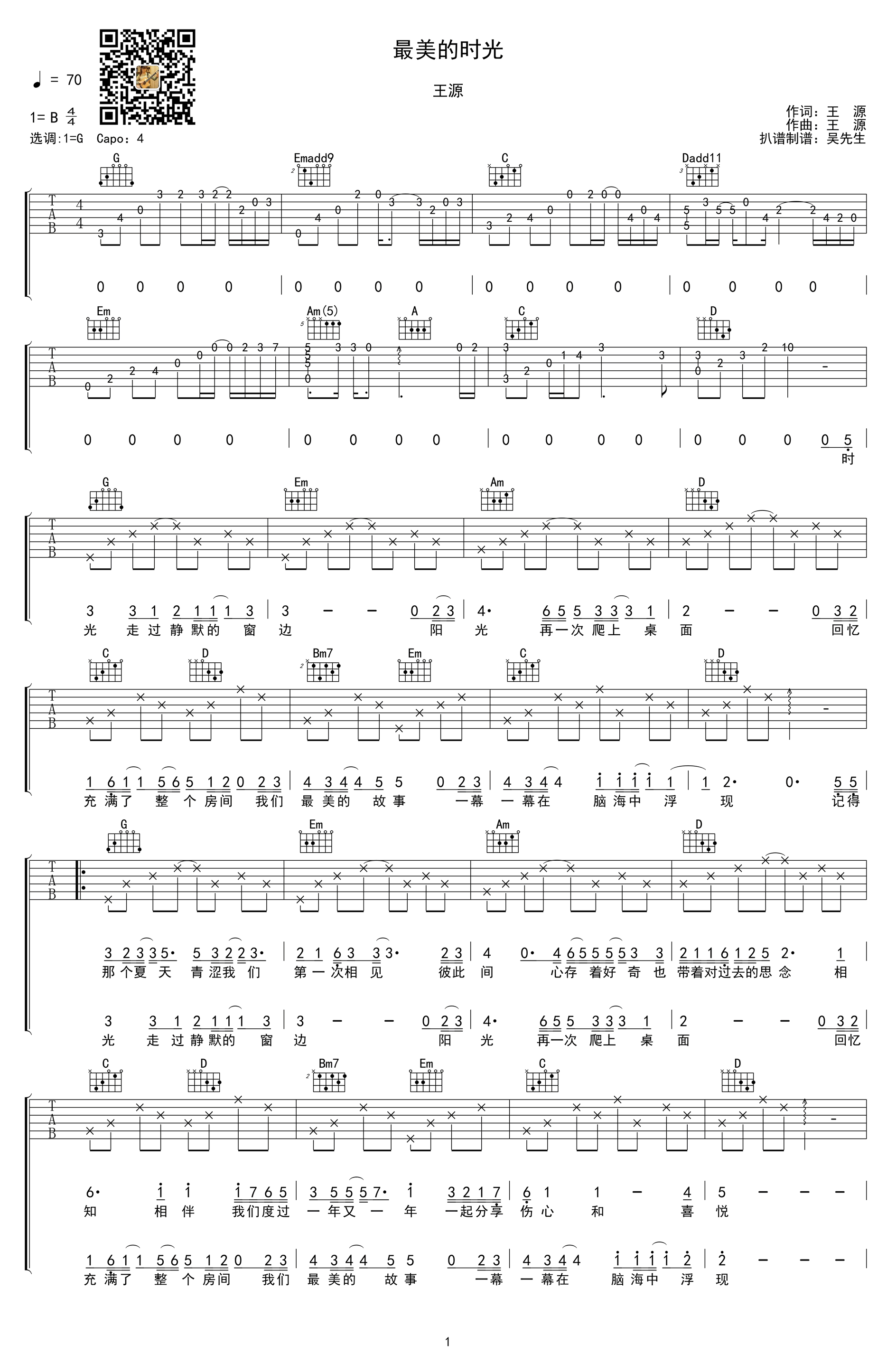 曲谱介绍: 王源《最美的时光》吉他弹唱谱,采用B调指法编配,共有2张高清图谱,免翻页排版设计。