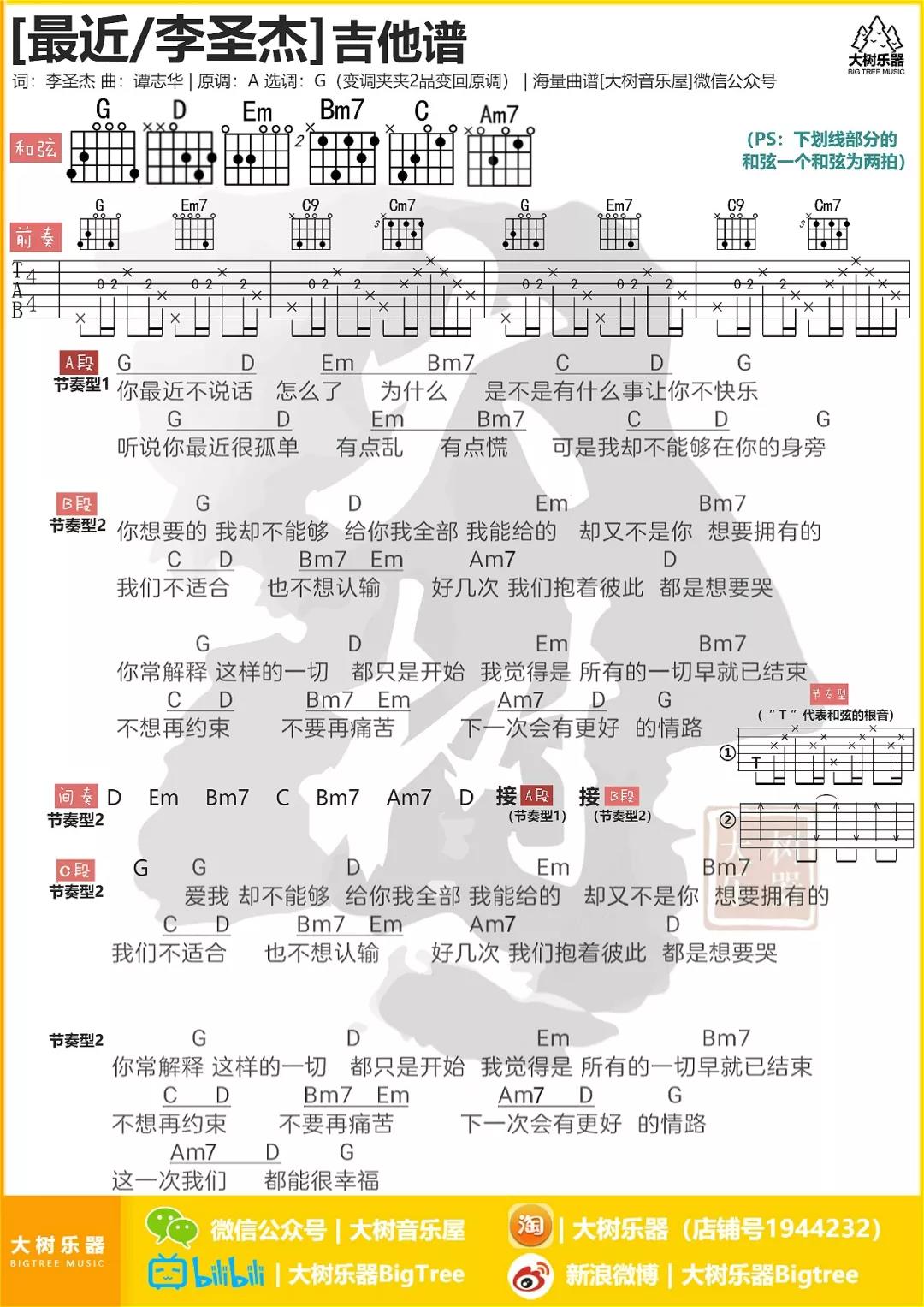 曲谱介绍: 李圣杰《最近》吉他弹唱谱,采用G调指法编配,共有1张高清图谱,免翻页排版设计。