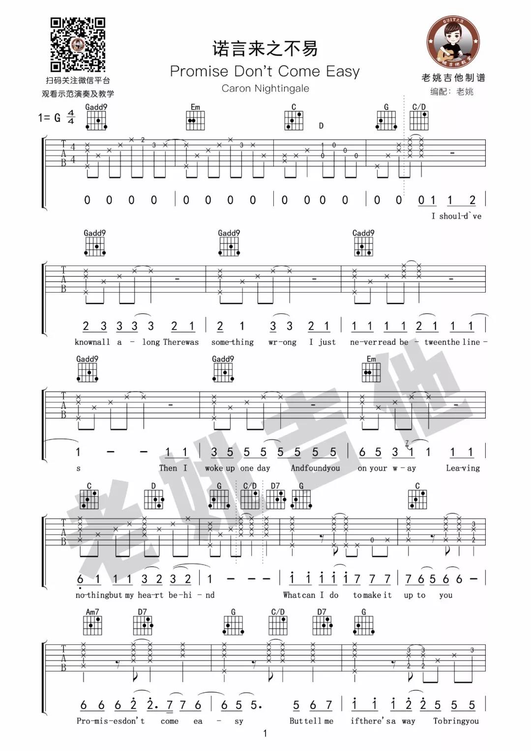 曲谱介绍: Caron,Nightingale《诺言来之不易》吉他弹唱谱,采用G调指法编配,共有4张高清图谱。