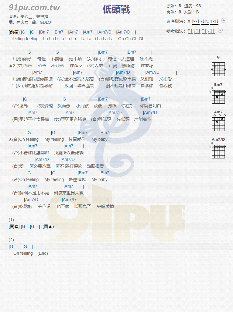 低头战吉他谱 - 安心亚,宋柏纬 - B调吉他弹唱谱