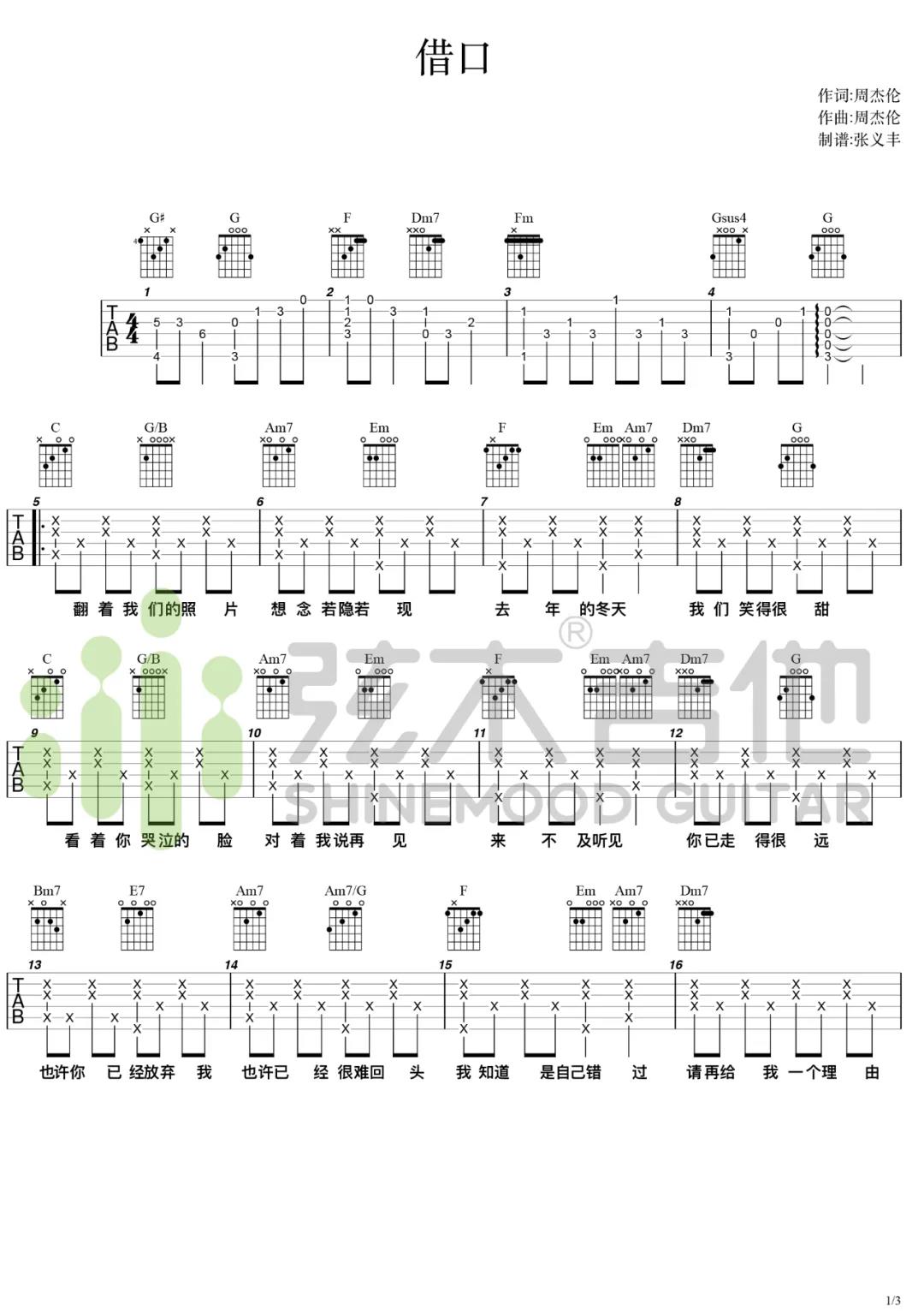 曲谱介绍: 周杰伦《借口》吉他弹唱谱,采用G调指法编配,共有3张高清图谱。