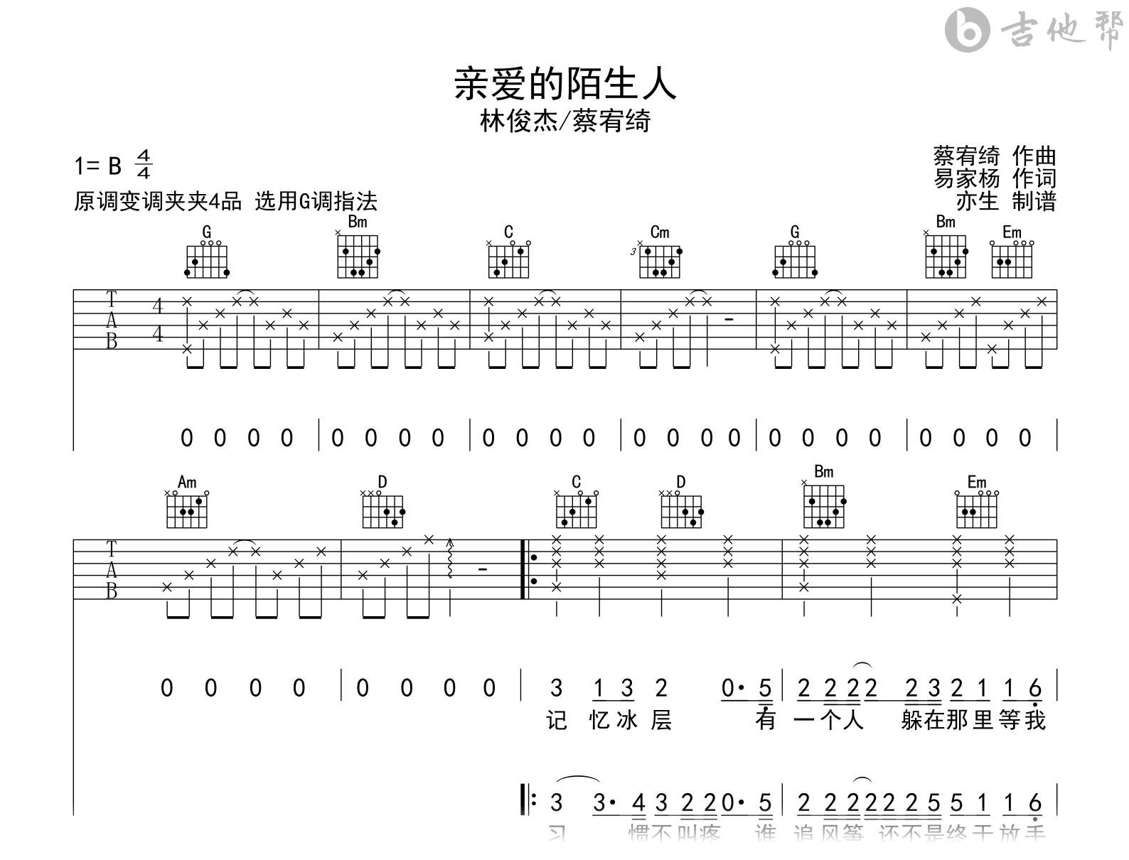 曲谱介绍: 亲爱的陌生人吉他谱,林俊杰/蔡宥绮演唱, 《亲爱的陌生人》吉他弹唱谱,原调B调,采用G调和弦指法,推荐变调夹夹第4品,节奏4/4拍,演奏速度大约每分钟95拍,演奏难度为简单。 林俊杰在新加坡《JJ20》世界巡迴演唱会,向歌迷们郑重介绍新人歌手蔡宥绮,习惯不叫疼,谁追风筝还不是终于放手,不管走或不走,都再也拿不走的青春。