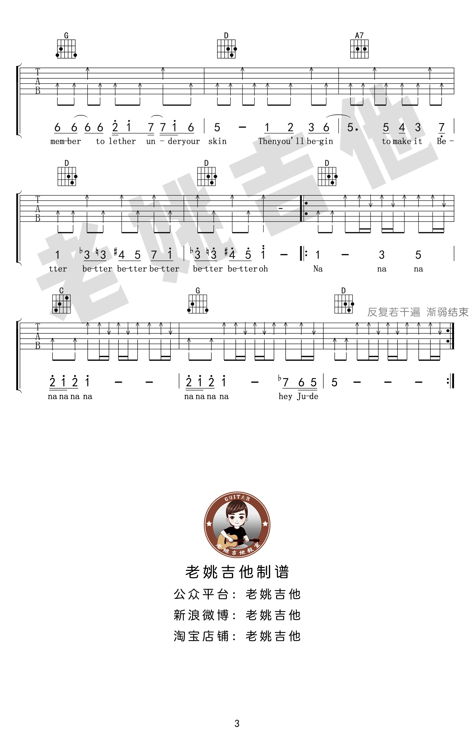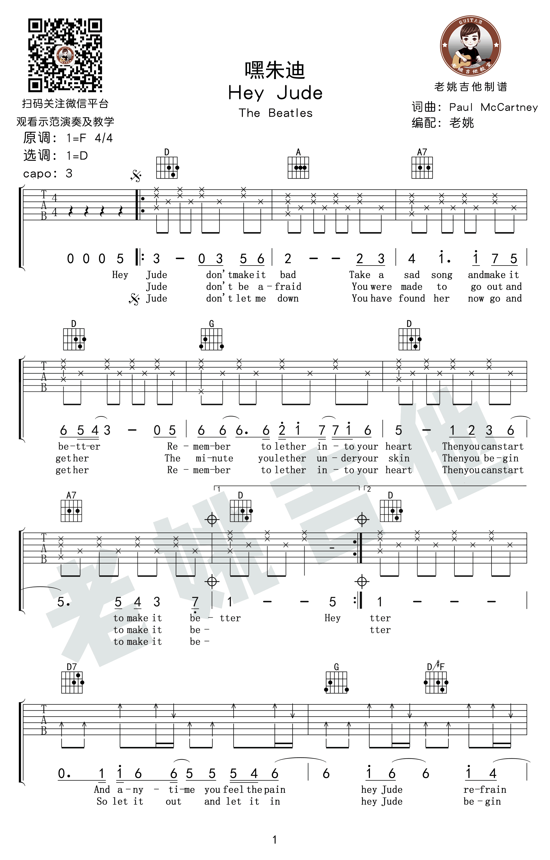 曲谱介绍: The,Beatles《HeyJude》吉他弹唱谱,采用D调指法编配,共有3张高清图谱。