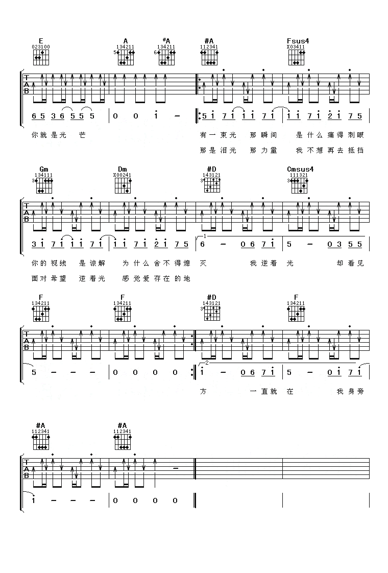 曲谱介绍: 孙燕姿《逆光》吉他弹唱谱,采用A调指法编配,共有4张高清图谱。