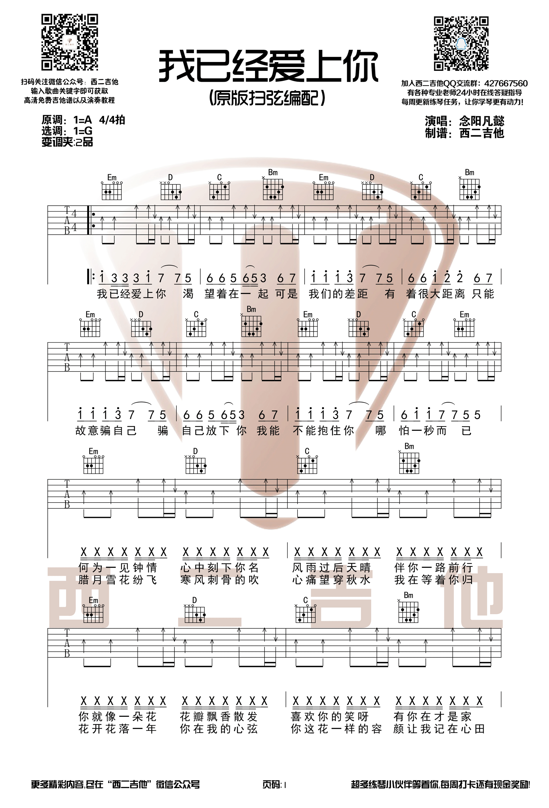 曲谱介绍: 念阳凡懿《我已经爱上你》吉他弹唱谱,采用G调指法编配,共有2张高清图谱,免翻页排版设计。