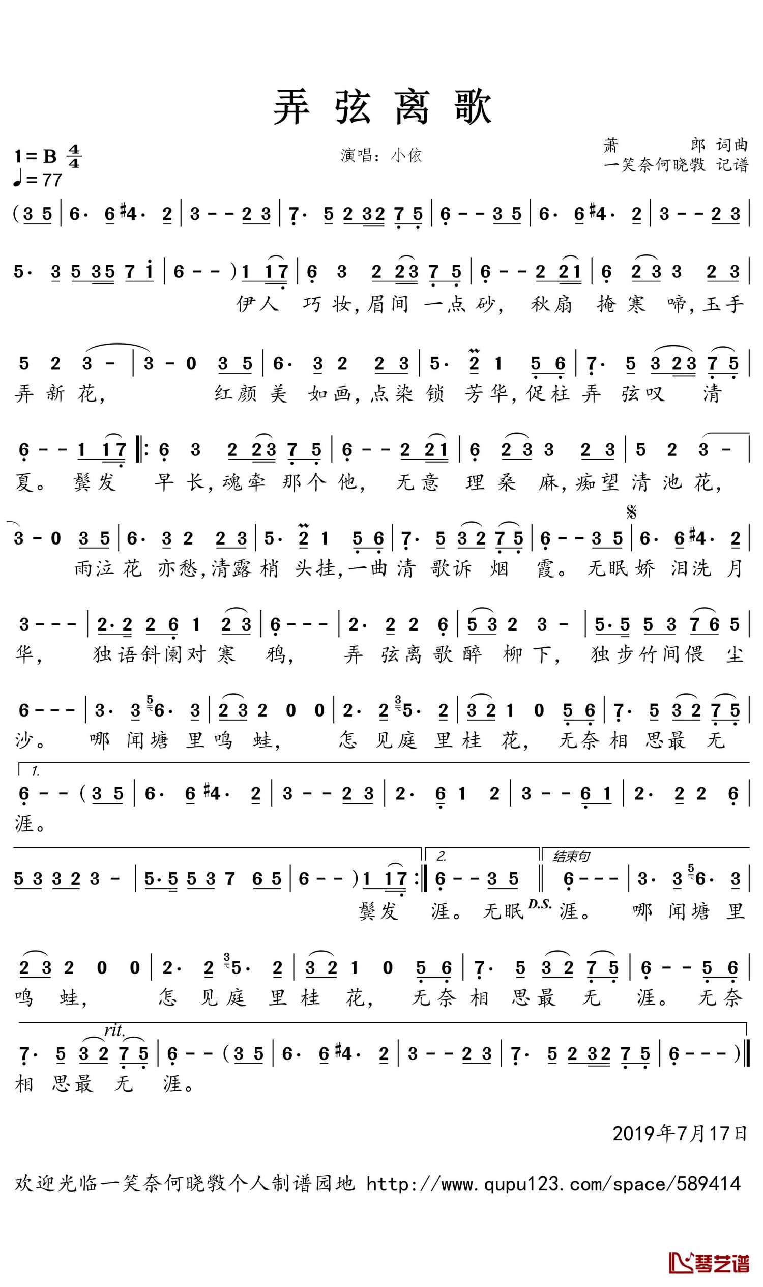 曲谱介绍:   弄弦离歌简谱歌词   词:萧郎  曲:萧郎  伊人巧妆  眉间一点砂  秋扇掩寒啼  玉手弄新花  红颜美如画  点染锁芳华  促柱弄弦叹清夏  鬓发早长  魂牵那个他  无意理桑麻  痴望清池花  雨泣花亦愁  清露梢头挂  一曲清歌诉烟霞  无眠娇泪洗月华  独语斜阑对寒鸦  弄弦离歌醉柳下  独步竹间偎尘沙  哪闻塘里鸣蛙  怎见庭里桂花  无奈相思最无涯  鬓发早长  魂牵那个他  无意理桑麻  痴望清池花  雨泣花亦愁  清露梢头挂  一曲清歌诉烟霞  无眠娇泪洗月华  独语斜阑对寒鸦  弄弦离歌醉柳下  独步竹间偎尘沙  哪闻塘里鸣蛙  怎见庭里桂花  无奈相思最无涯  无眠娇泪洗月华  独语斜阑对寒鸦  弄弦离歌醉柳下  独步竹间偎尘沙  哪闻塘里鸣蛙  怎见庭里桂花  无奈相思最无涯  哪闻塘里鸣蛙  怎见庭里桂花  无奈相思最无涯  无奈相思最无涯