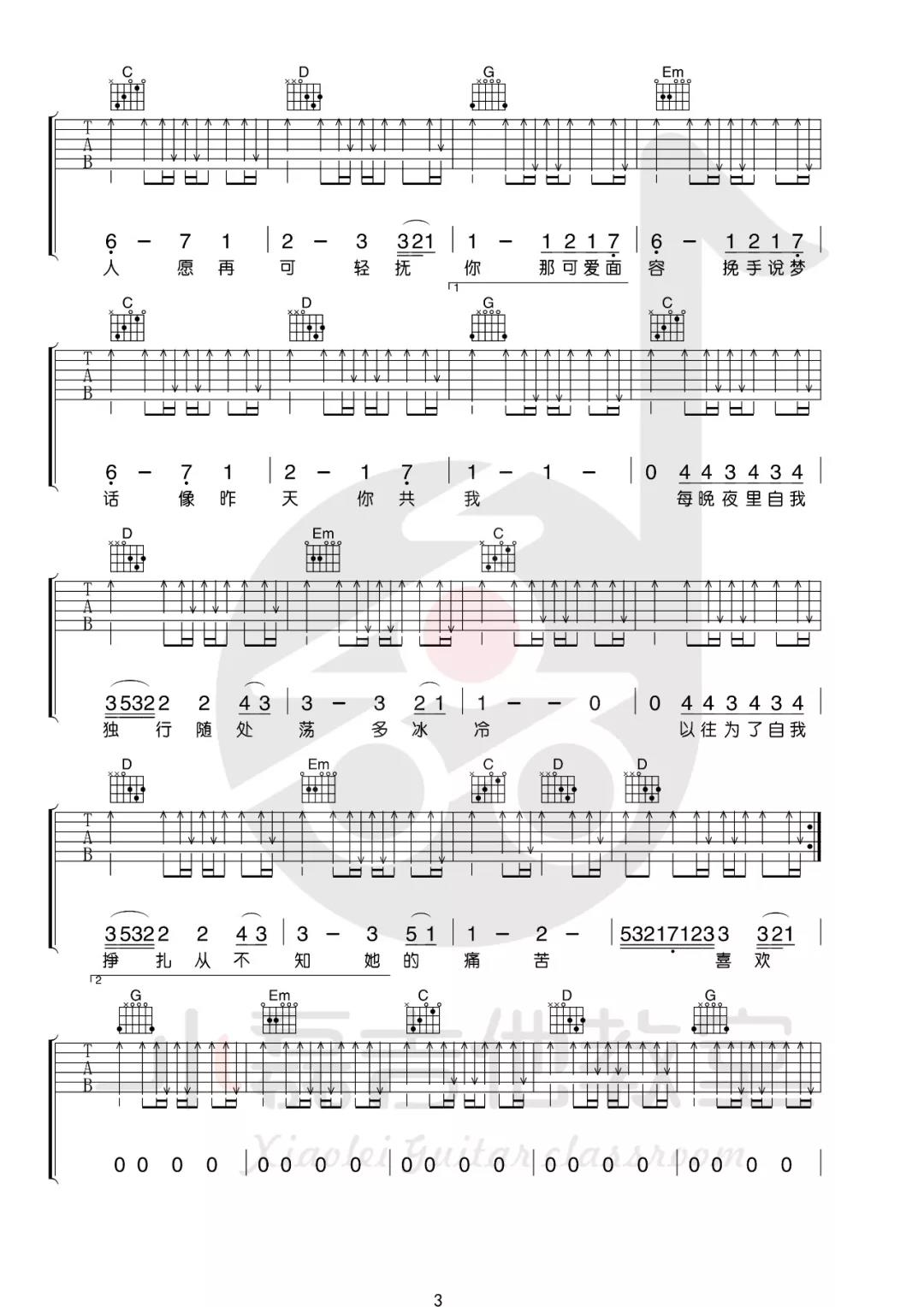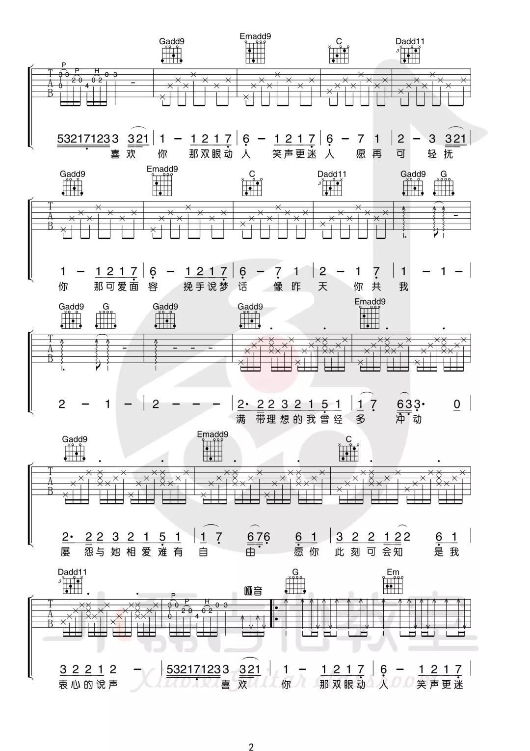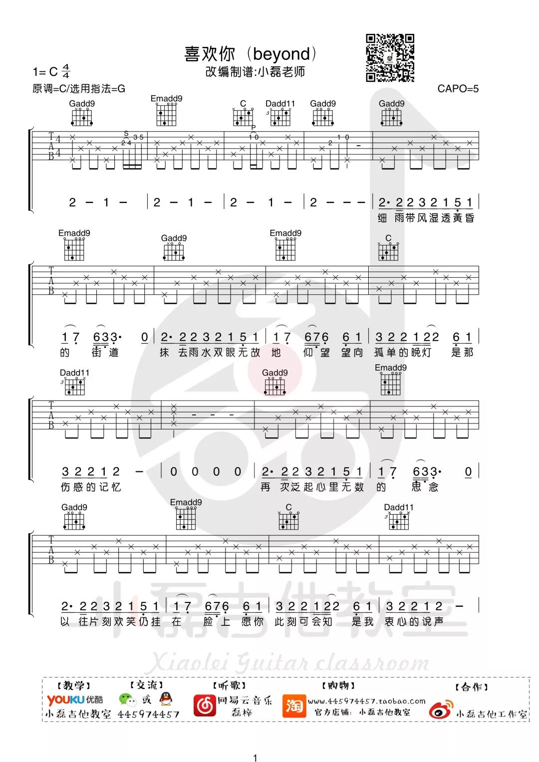 曲谱介绍: Beyond《喜欢你》吉他弹唱谱,采用G调指法编配,共有4张高清图谱。