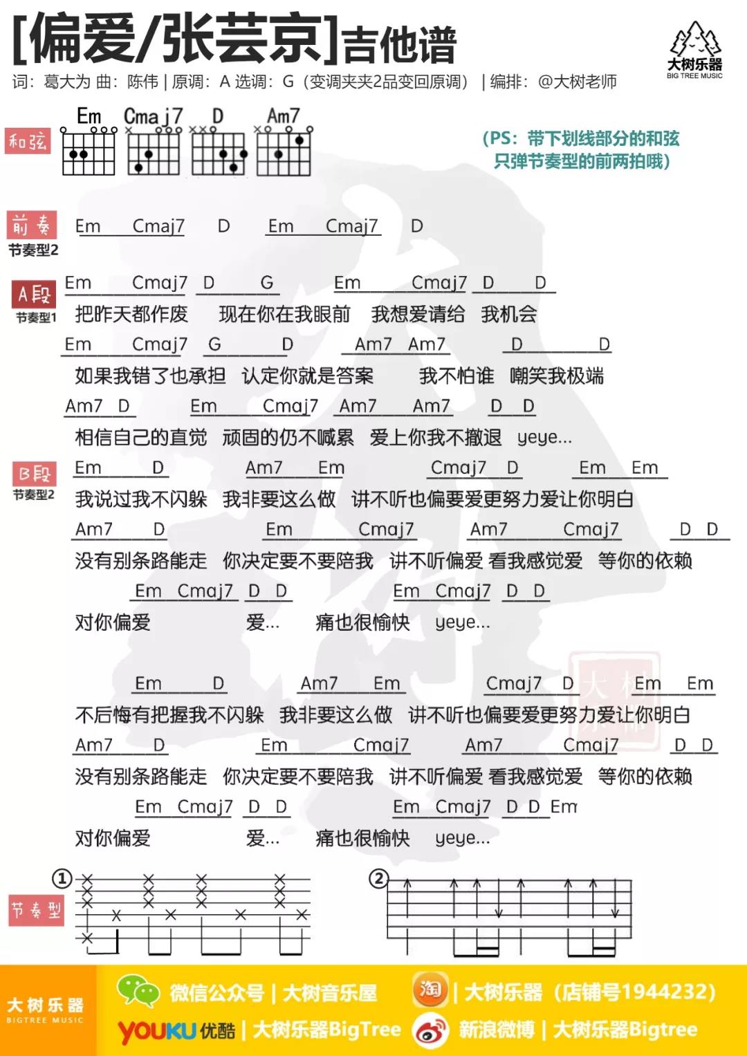 曲谱介绍: 张芸京《偏爱》吉他弹唱谱,采用G调指法编配,共有1张高清图谱,免翻页排版设计。