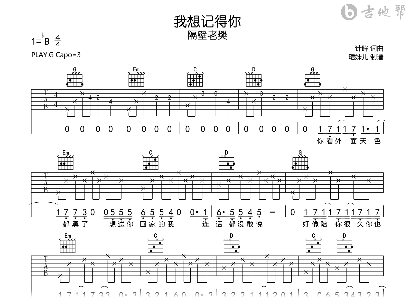 我想记得你吉他谱 - 隔壁老樊 - G调吉他弹唱谱