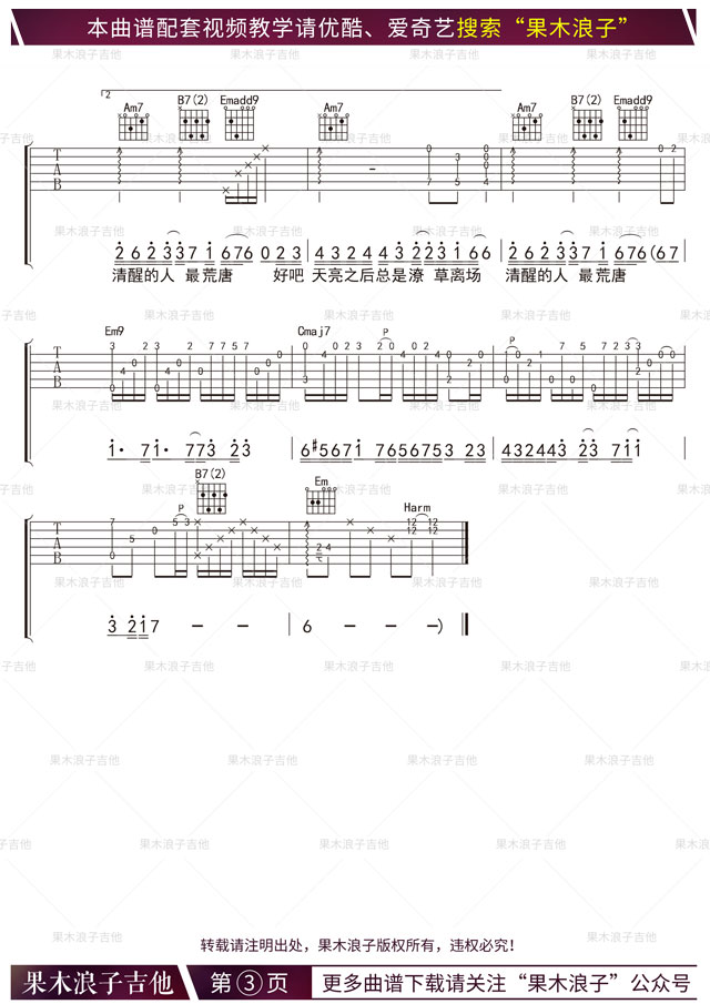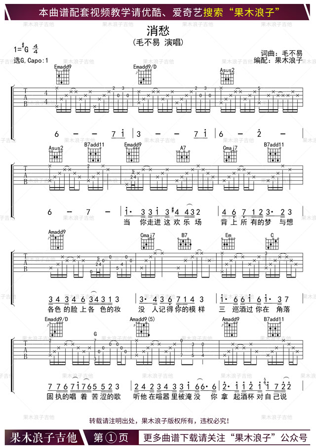 曲谱介绍: 毛不易《消愁》吉他弹唱谱,采用G调指法编配,共有3张高清图谱。
