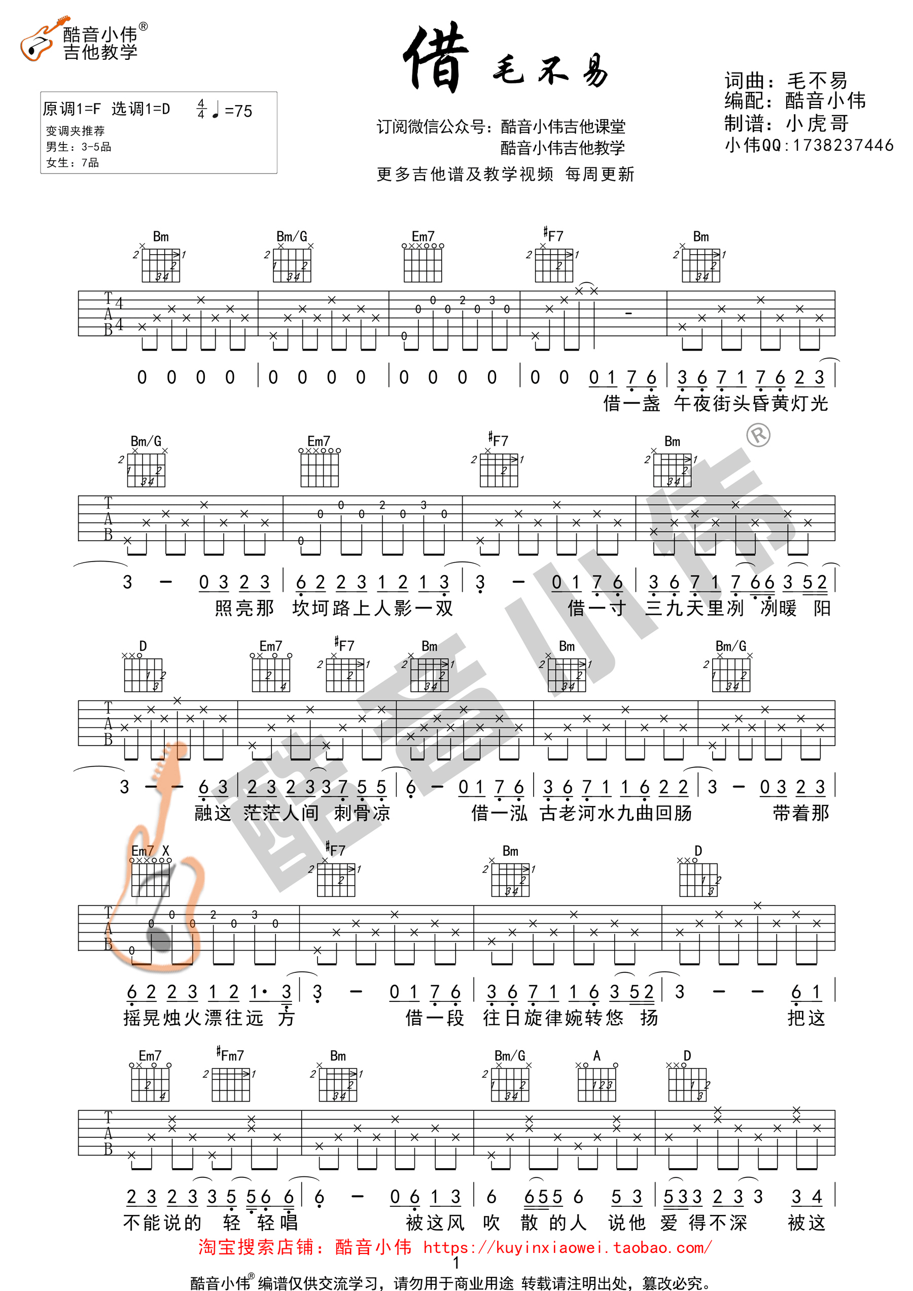 曲谱介绍: 毛不易《借》吉他弹唱谱,采用D调指法编配,共有3张高清图谱。