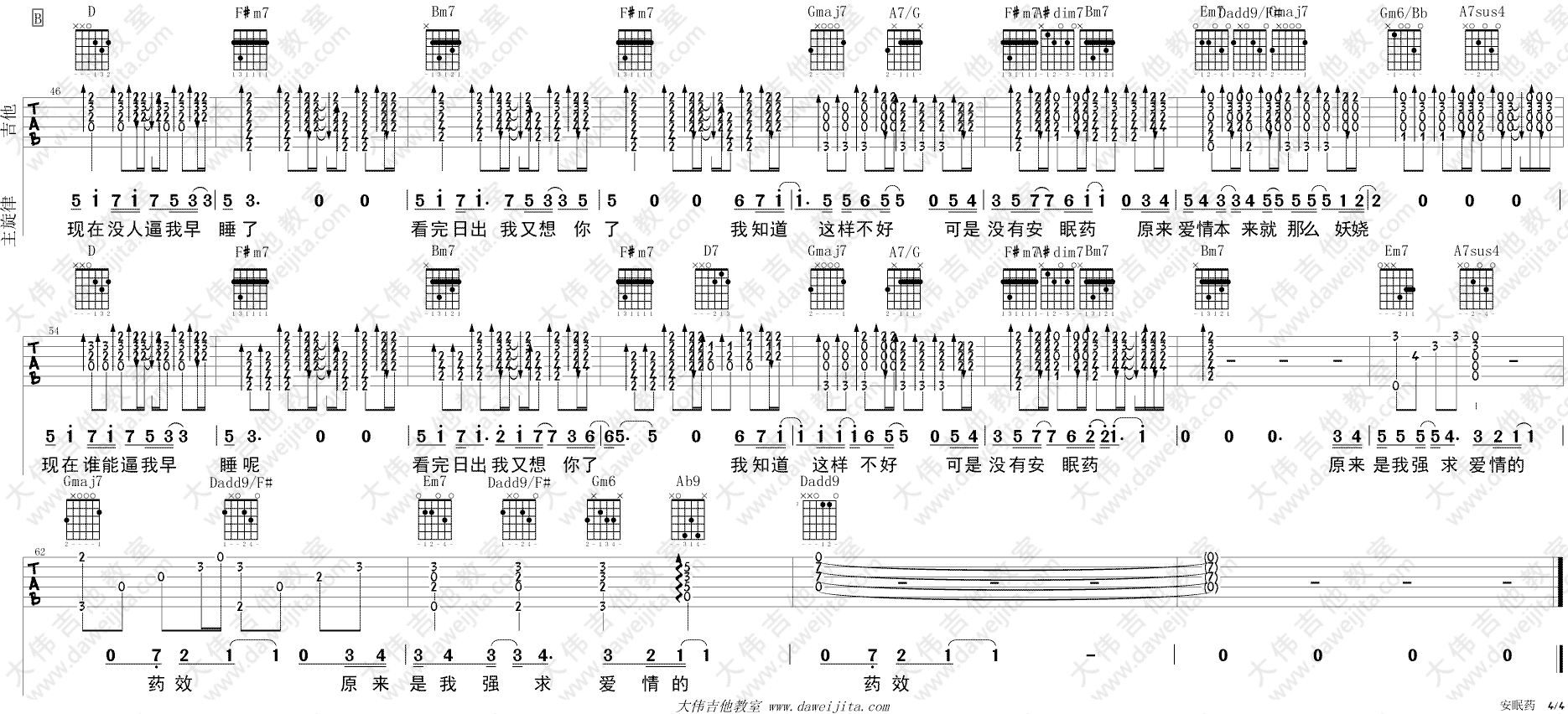 曲谱介绍: 张禄籴《安眠药》吉他弹唱谱,采用D调指法编配,共有4张高清图谱。