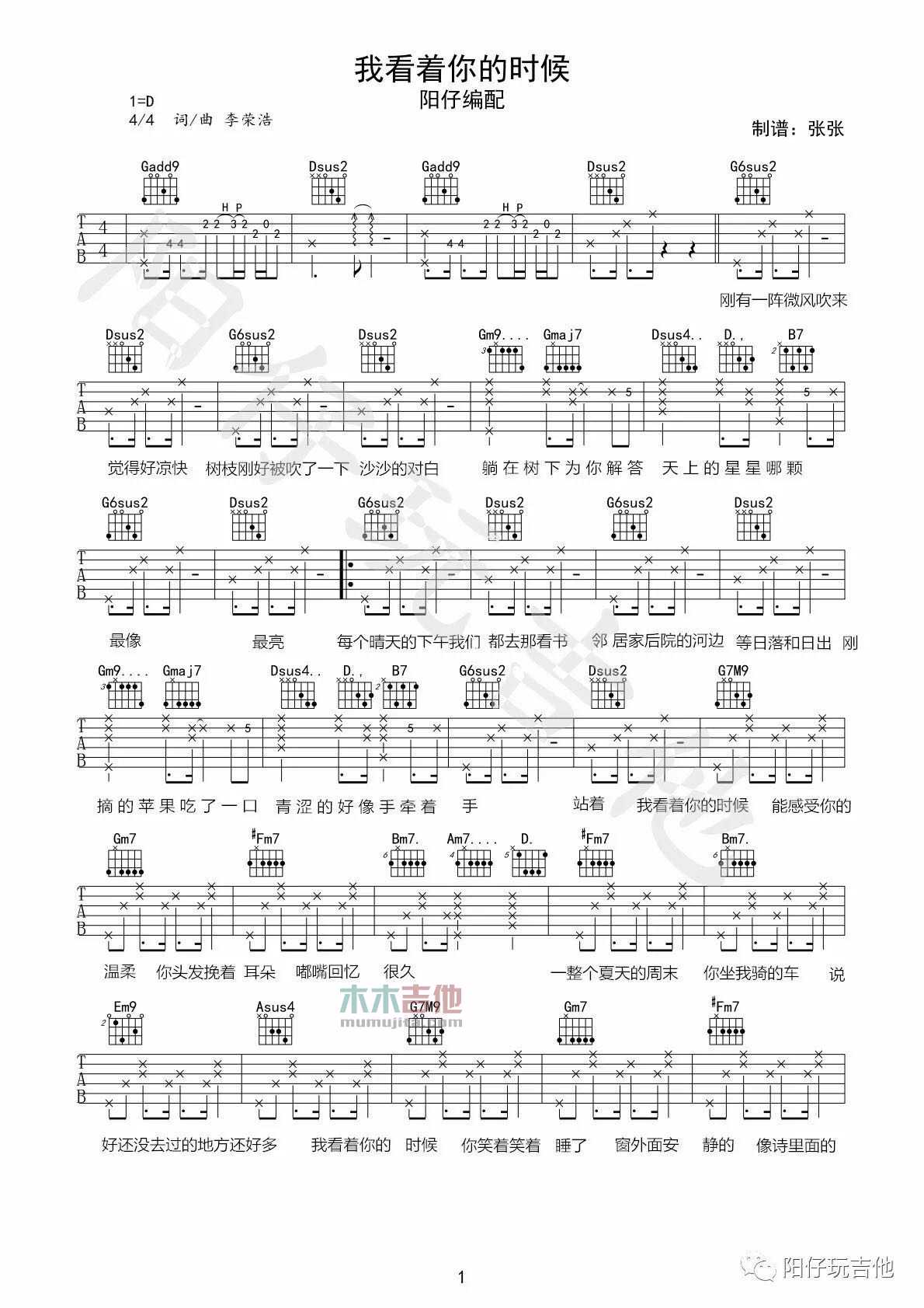 曲谱介绍: 李荣浩《我看着你的时候》吉他弹唱谱,采用D调指法编配,共有2张高清图谱,免翻页排版设计。